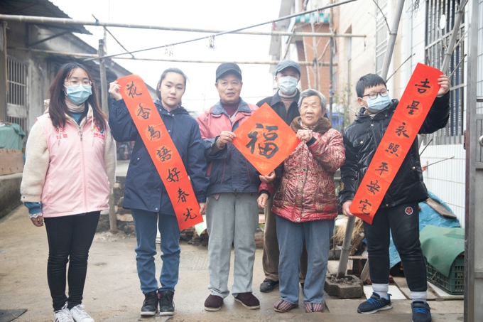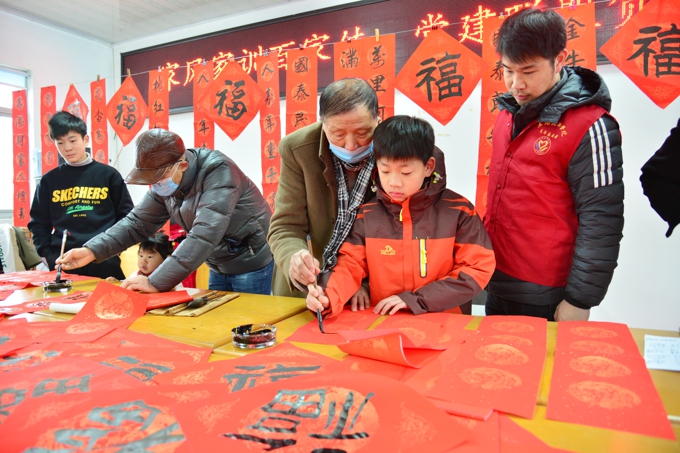 活动开始前,志愿者们将手写的十余种字体的百张福字平铺于桌面上,引大家连连称赞,活动现场人头攒动、热闹非凡。现场写的春联更是令人赞赏不绝。“尊贤敬老道德好,爱少惜才新风尚”,“文明时代诚为贵,礼义家庭孝保鲜”……志愿者们一边挥毫泼墨,一边向小朋友们解释意思,淡淡的墨香中充斥着欢声笑语,几张书桌旁聚满了等待的居民。一个个诠释美满幸福的“福”字,向社区居民提前拜年,表达新年的祝愿;一幅幅红红火火的春联表达美好的愿望,希望新年有个新气象。“感谢太湖学院的志愿者们,这是我今年收到的第一份祝福、第一份礼物”一位老奶奶抱着春联和“福”字,兴奋地道谢。