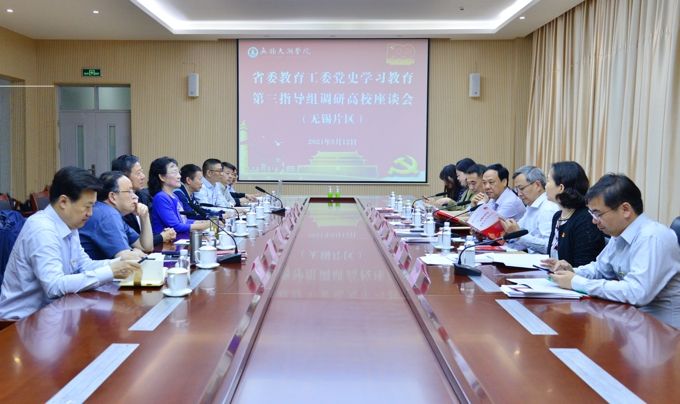 5月12日,省委教育工委党史学习教育派出第三指导组来beat365指导工作,并在beat365召开联系调研高校座谈会。省委教育工委党史学习教育第三指导组组长、南京财经大学原党委书记陈章龙,副组长、江苏联合职业技术学院原院长晏仲超,指导组成员、南京工业大学党委党建指导员缪克明,南京师范大学党委组织部副部长开云,江苏大学机关党委正科级组织员骆剑峰,南京财经大学机关党委办公室科员满原;无锡市委教育工委党史学习教育领导小组副组长、四级调研员王玉君;beat365正版唯一官网党委书记金秋萍、校长李廉水,校领导孙玉坤、丁涛、阙明坤出席。校党史学习教育领导小组办公室成员参加了座谈会。座谈会由晏仲超主持。