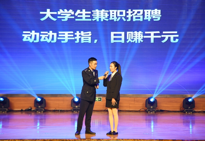 活动期间,反诈宣讲员大亮老师结合校园电信网络诈骗特点,通过案例讲解、手法分析等向现场学生介绍了“套路贷”“网络刷单”等常见的电信诈骗类型和几种针对学生的电信诈骗手段及防范技巧。活动中,还组织了反诈歌舞串烧、反诈小品、反诈课堂、快板说反诈等各类文艺表演活动,活动现场气氛十分热烈。