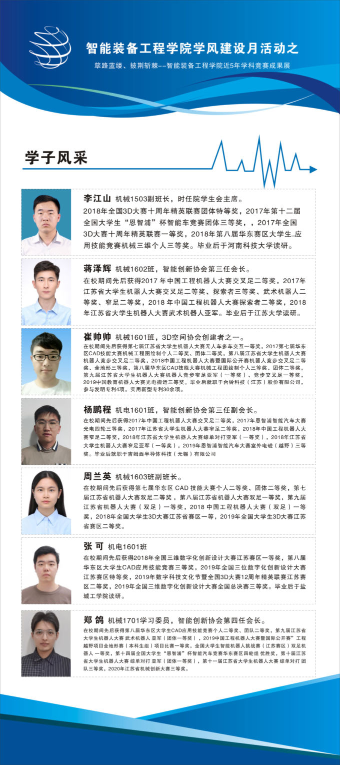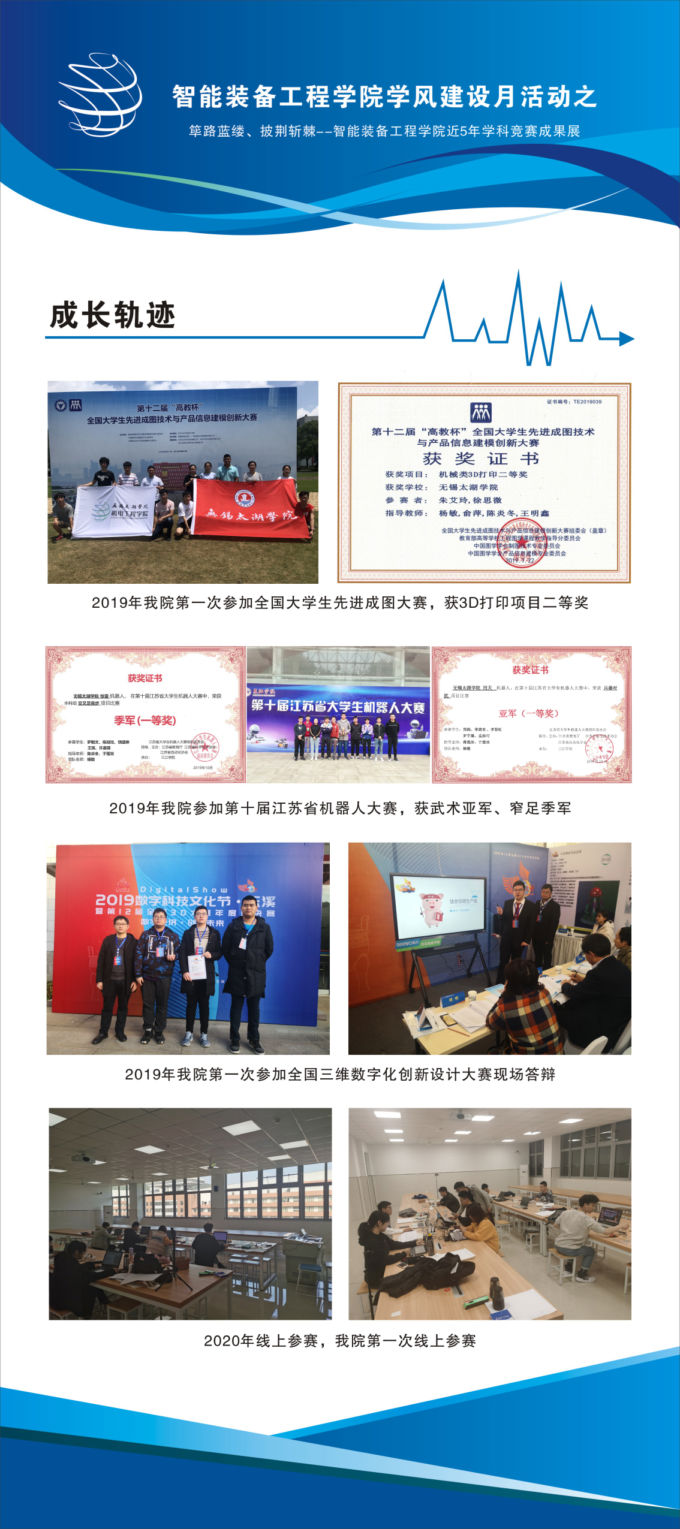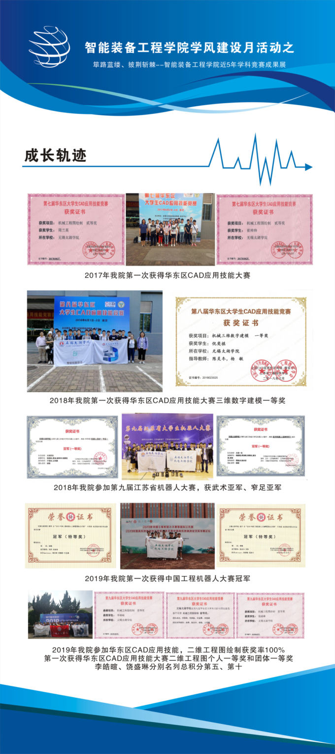 成果展主要展出智能装备工程学院学生近五年来在全国各大型比赛中取得的成绩,展示了部分优秀学子风采。