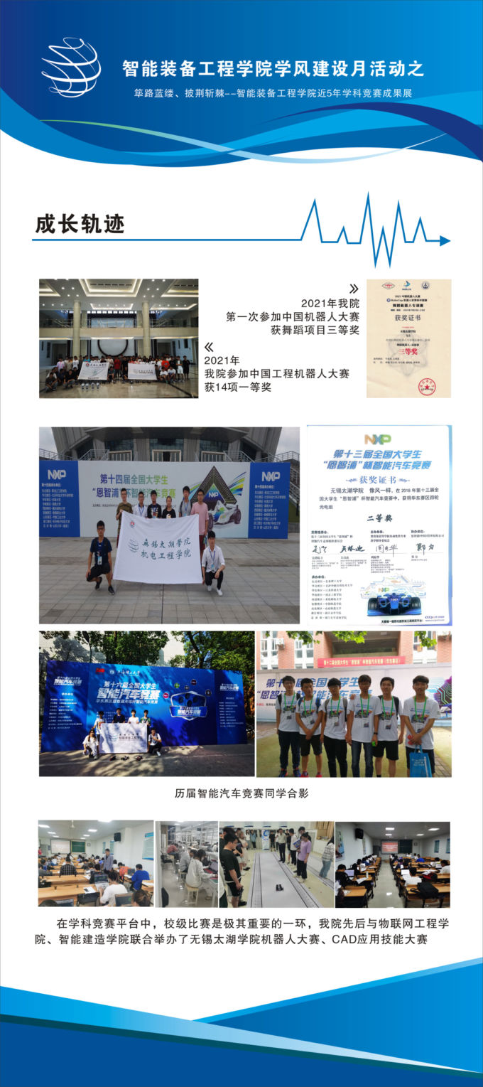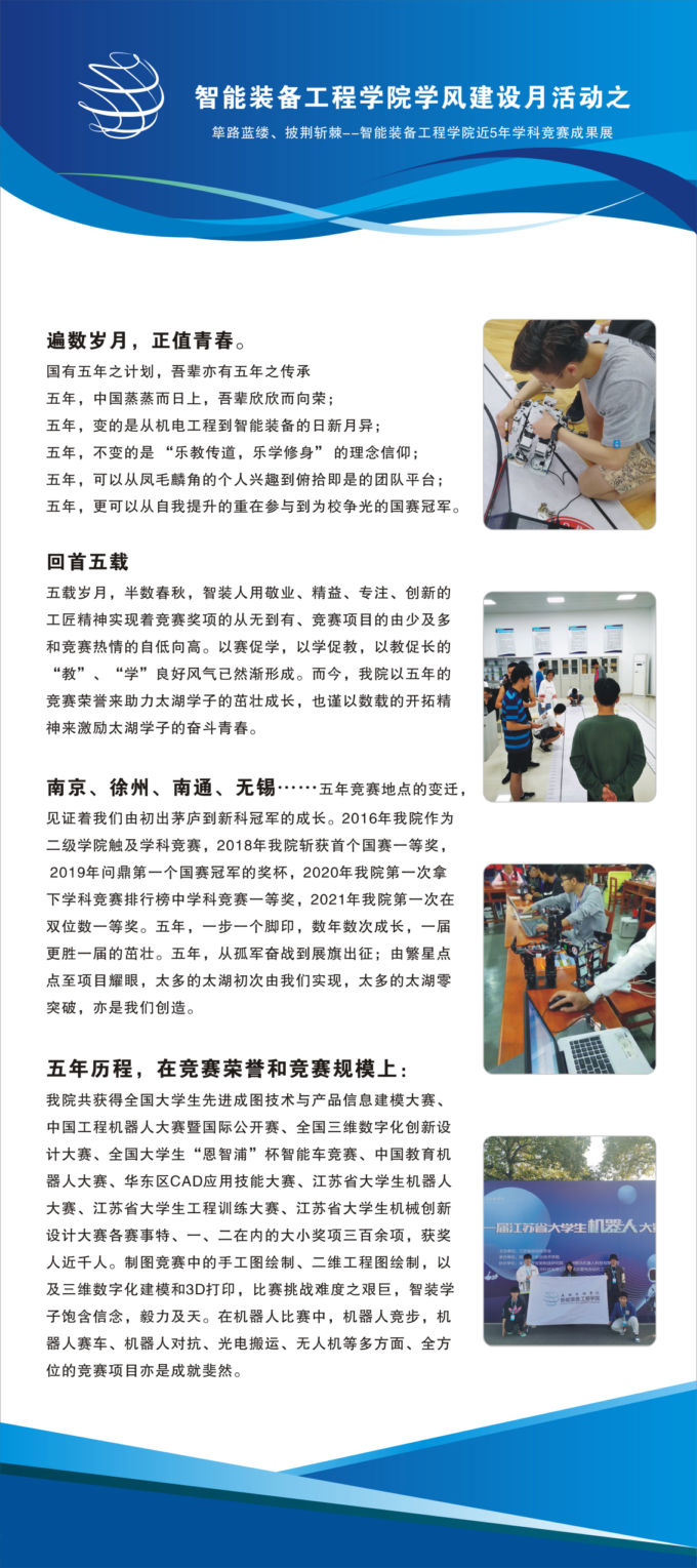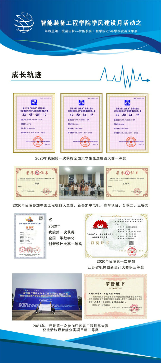 2021年12月6日,筚路蓝缕、披荆斩棘--智能装备工程学院近五年学科竞赛成果展在六号教学楼一楼大厅举行。此次成果展以学风建设月为主题,由智能装备工程学院主办,吸引了全校师生的眼球。