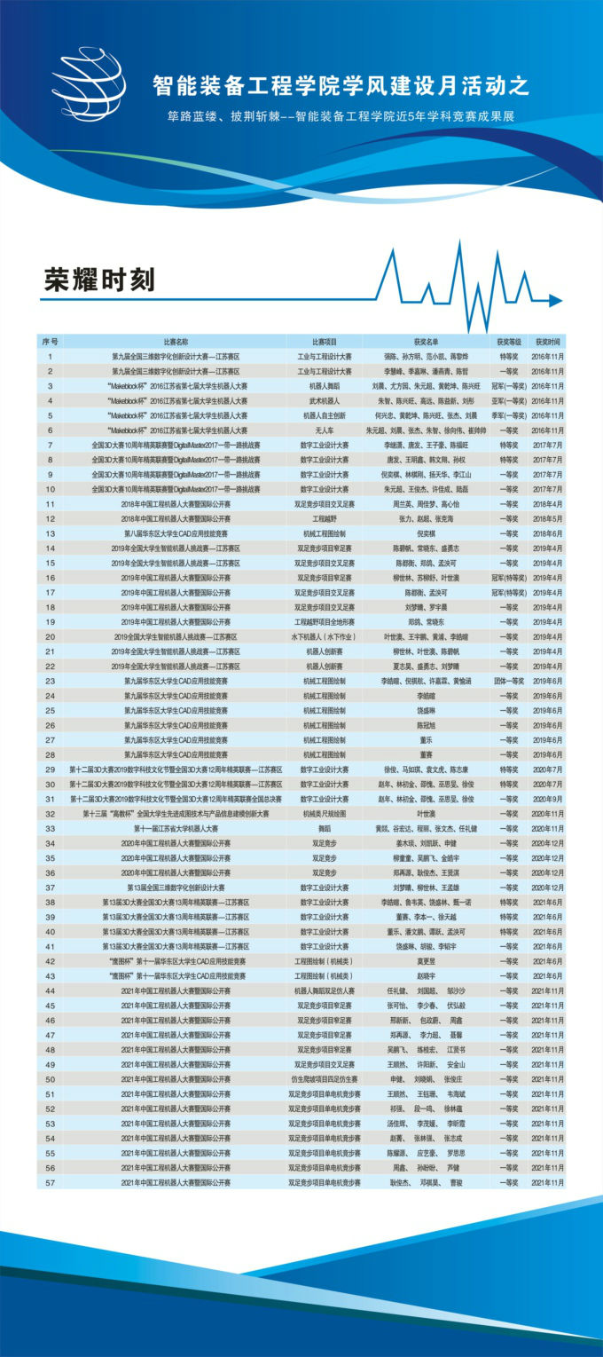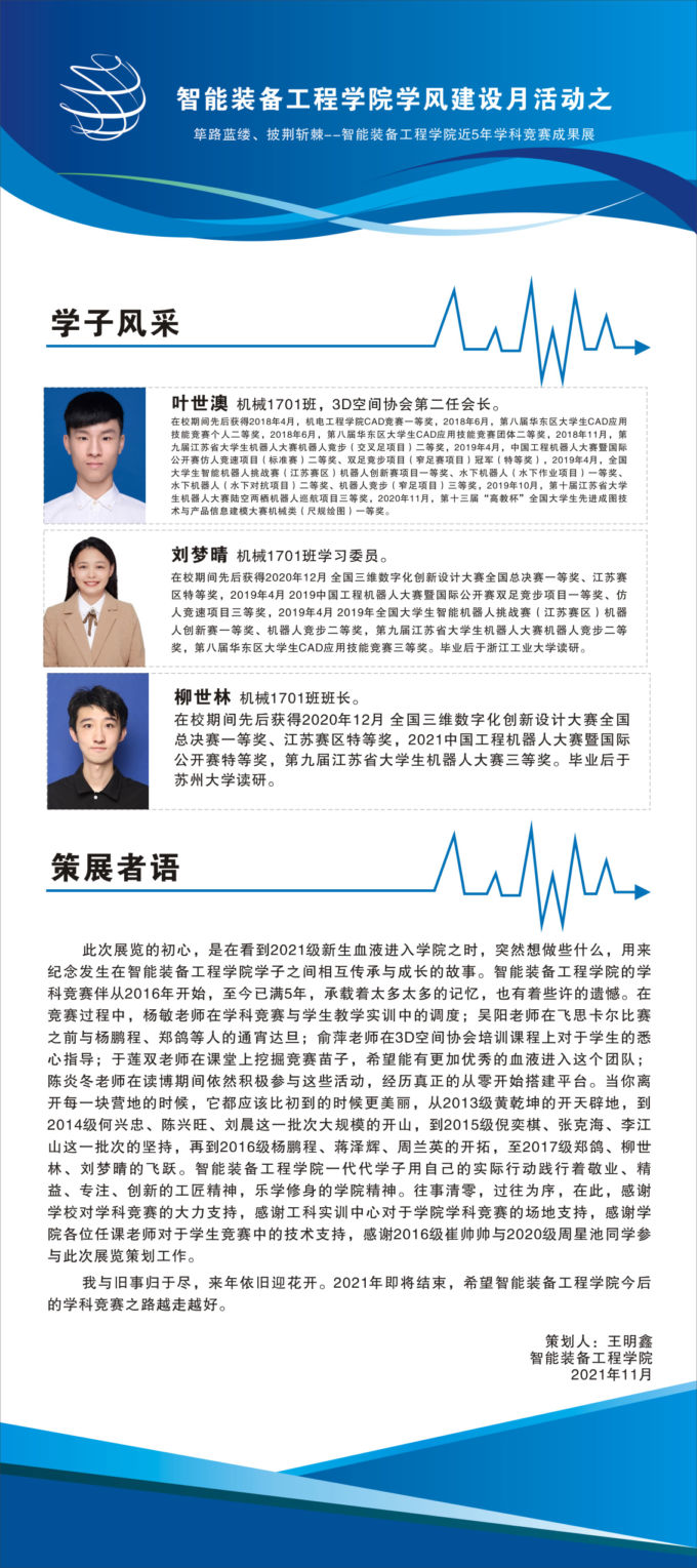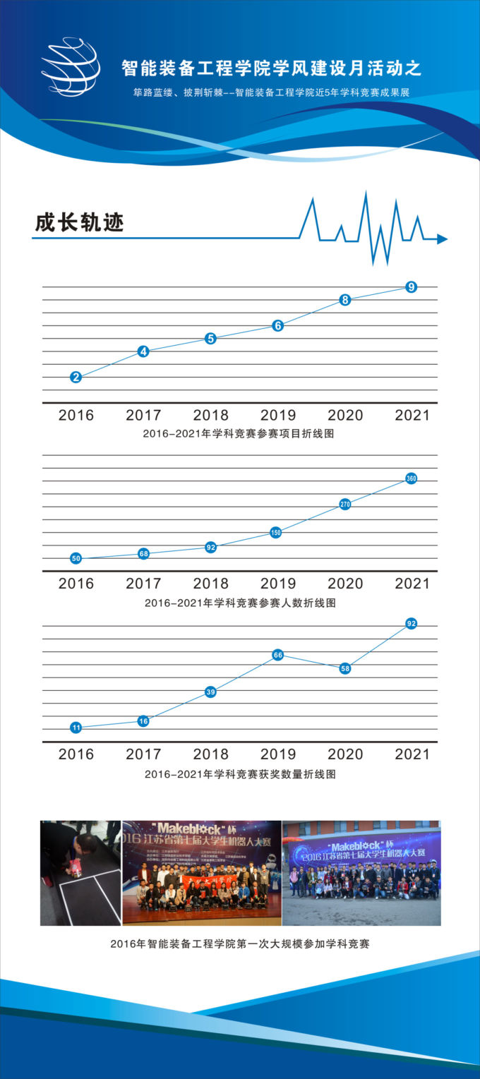 2021年12月6日,筚路蓝缕、披荆斩棘--智能装备工程学院近五年学科竞赛成果展在六号教学楼一楼大厅举行。此次成果展以学风建设月为主题,由智能装备工程学院主办,吸引了全校师生的眼球。
