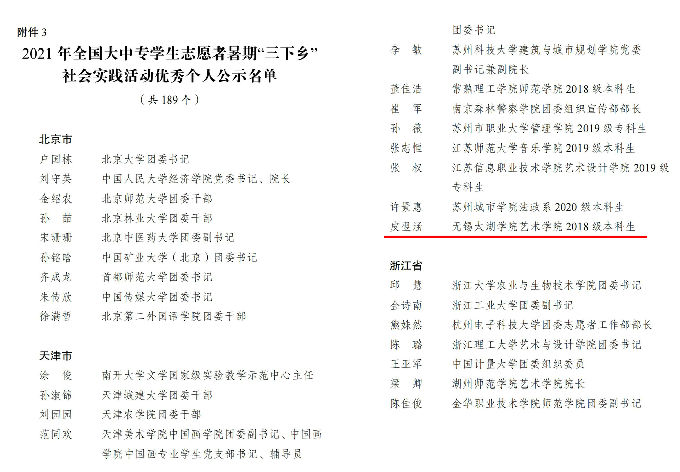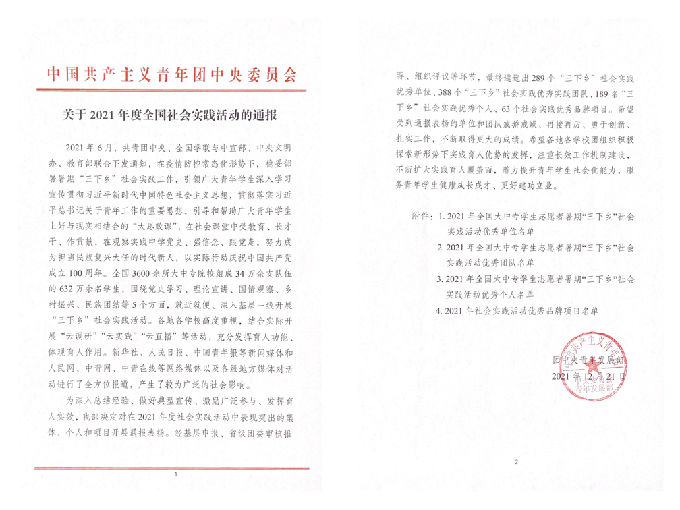 近日,共青团中央对2021年暑期“三下乡”社会实践活动中表现突出的集体和个人进行了表彰。其中,beat365皮翌涵同学荣获2021年全国“三下乡”社会实践活动优秀个人,这也是beat365学生首次在“三下乡”社会实践活动中获得国家级个人荣誉。