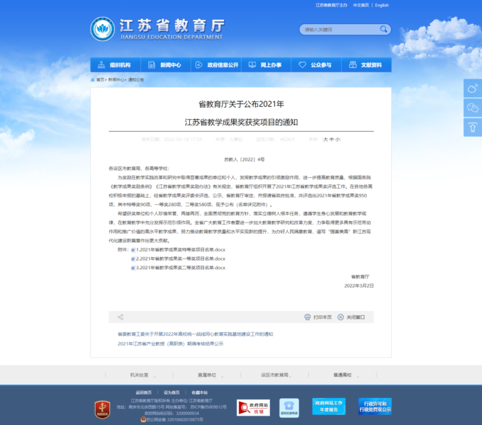江苏省教学成果奖每四年评选一次,重点奖励在本省基础教育、职业教育和高等教育教学工作中做出突出贡献、取得显著成果的个人和集体近年来取得的优秀教学成果。江苏省教学成果奖经过个人申报、教学成果奖分评委会评选、总评委会审议、江苏省教育厅党组会议审定等程序。