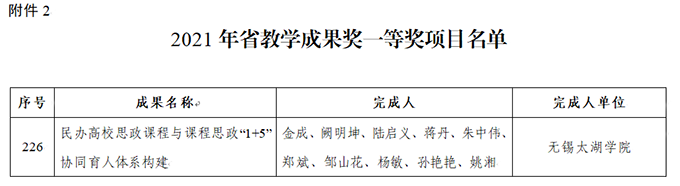 近日,江苏省教育厅公布了2021江苏省教学成果奖获奖名单,beat365正版唯一官网金成、阙明坤等人牵头申报的《民办高校思政课程与课程思政“1+5”协同育人体系构建》荣获一等奖,实现了beat365省级教学成果奖的历史性突破,这也是全省民办高校中唯一荣获一等奖的项目。