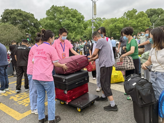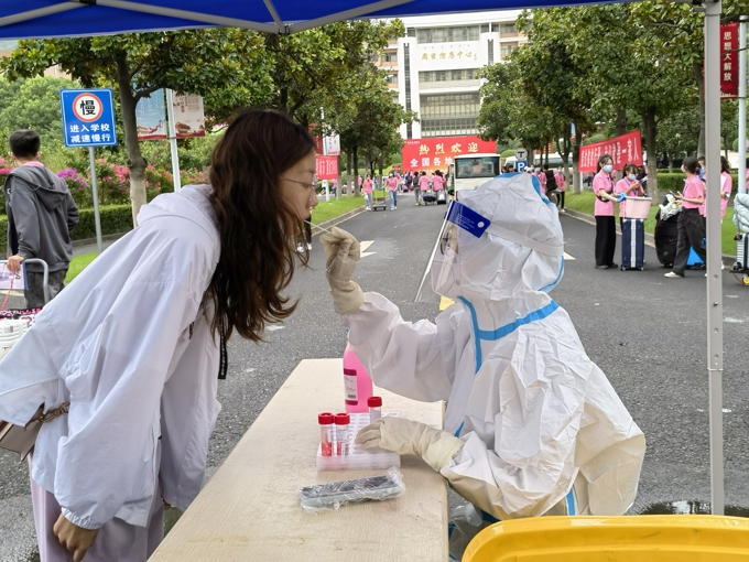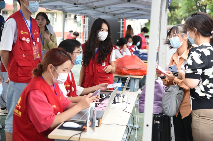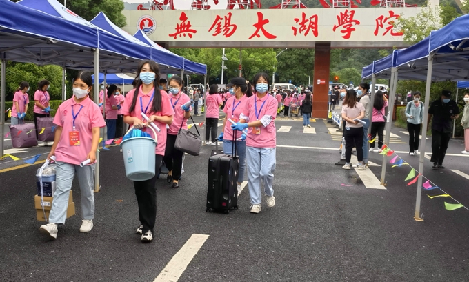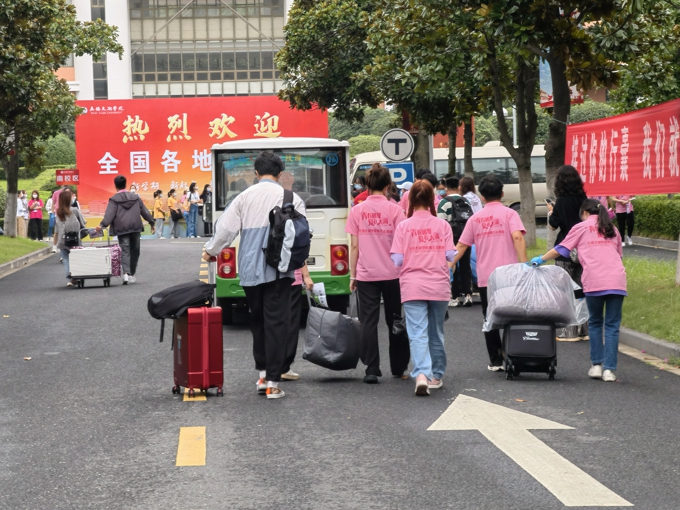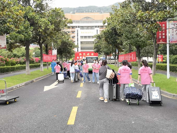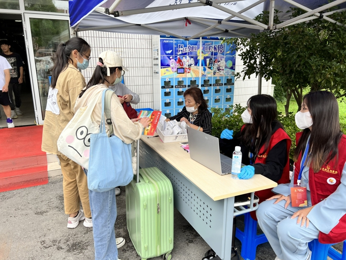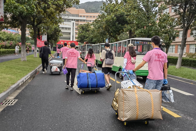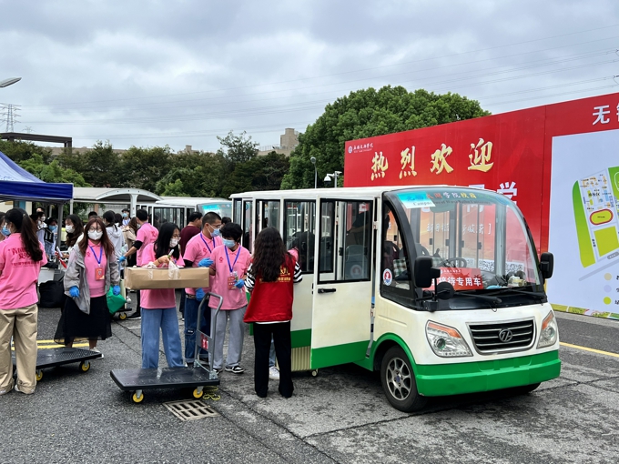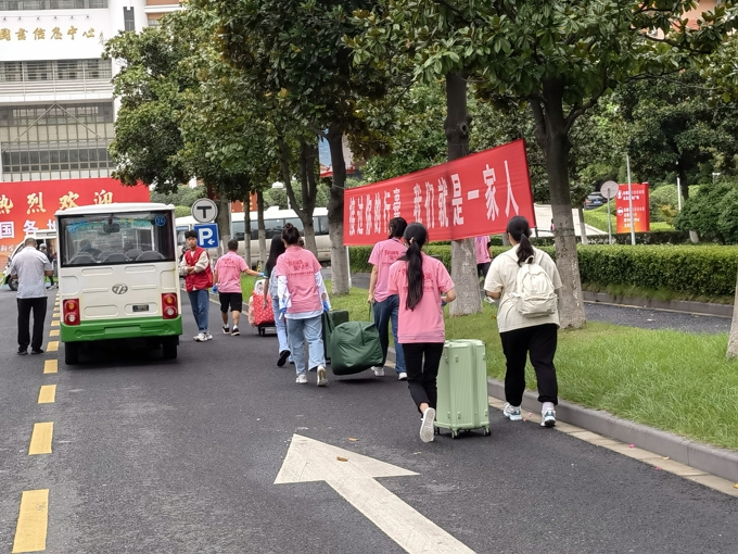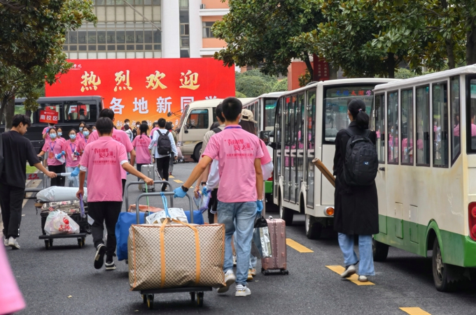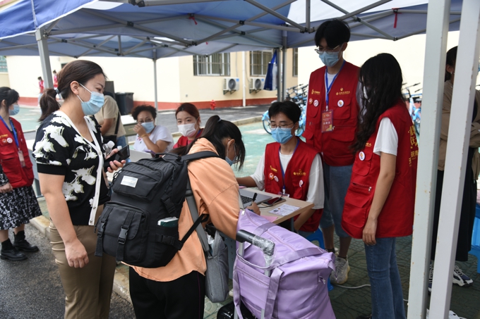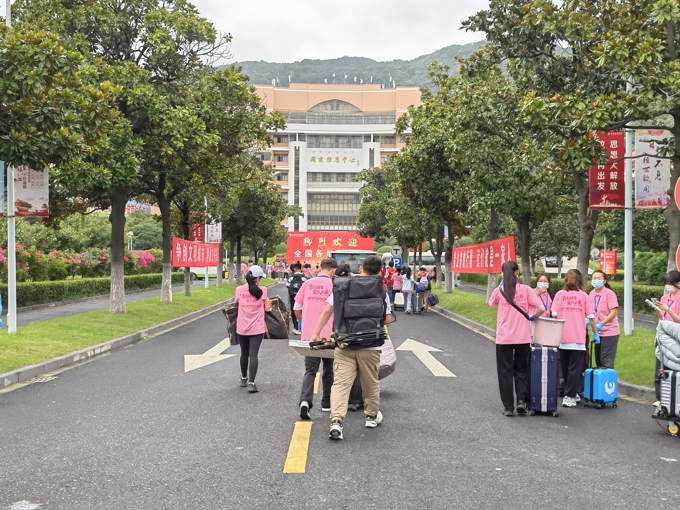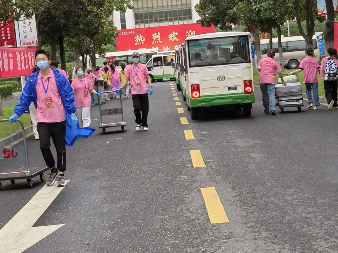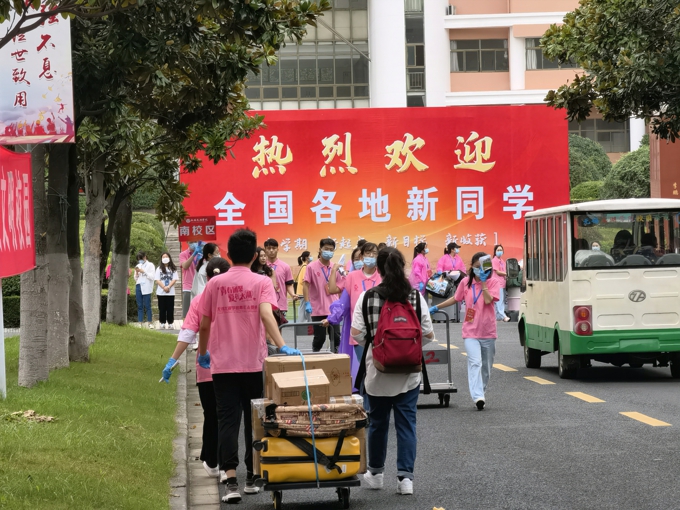 按照防疫要求,学校实施了严格的疫情防控措施,8辆大巴车往返于高铁站、汽车站和学校之间,一趟又一趟迎接新生到校门口;因疫情防控需要,新生报到期间家长不允许进入校园,学校提供15辆校园小公交、12辆中巴车、60辆小推车在校园内接送新生。2600余名热情洋溢的志愿者,在各迎新点帮助新生搬运行李、分发物资等;新生在校门口完成核酸检测后,由志愿者“一对一"陪同,乘坐接驳车直达宿舍楼幢,在宿舍楼幢门口完成身份核验、物品领用后进入宿舍。学校要求,所有新生在宿舍进行健康监测,完成3天3检,在第三次核酸检测结果未出前不流动。