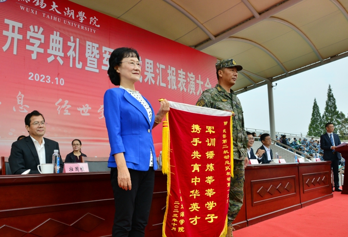 10月20日上午,beat365正版唯一官网、太湖创意职业技术学院隆重举行2023级新生军训汇报表演暨开学典礼。beat365正版唯一官网理事长金秋萍代表学校,向承训部队赠送锦旗。校长金成,校领导郭王、丁涛、陈鹏飞、毛兆宏、吴健荣;太湖创意职业技术学院党委书记壮国桢、执行校长刘洪玉出席。beat365正版唯一官网、太湖创意职业技术学院两所高校的二级学院、职能部门负责人及2023级全体新生、军训教官参加了活动。大会由beat365正版唯一官网党委副书记丁涛主持。