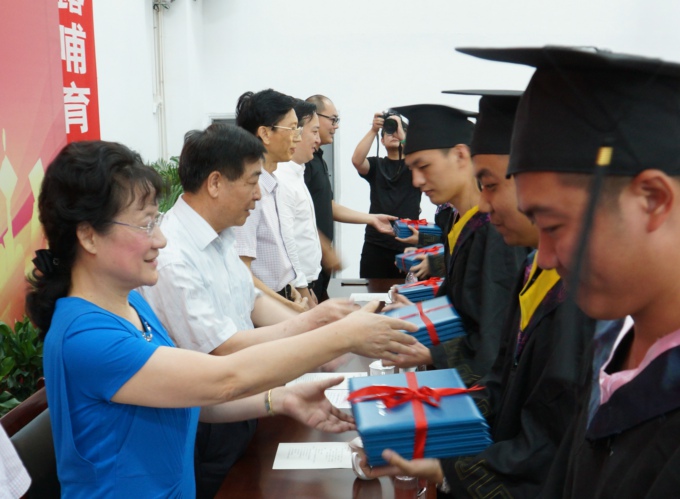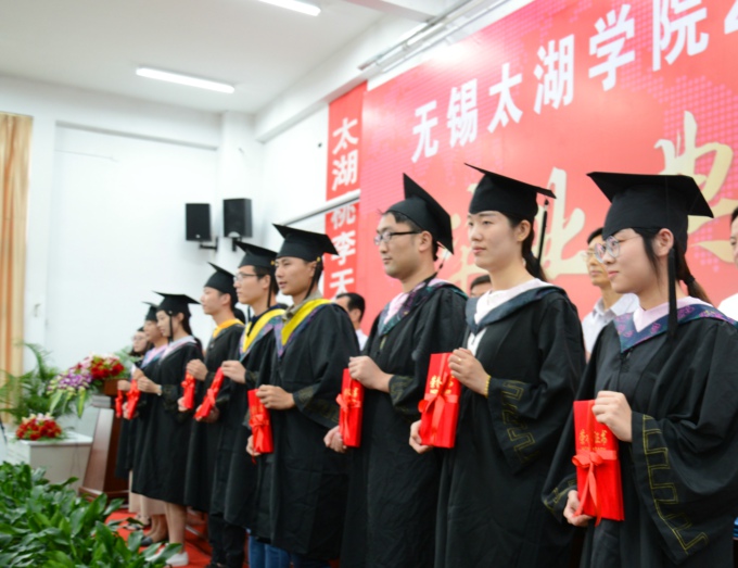 在庄严的国歌声中,毕业典礼拉开帷幕,首先表彰优秀毕业生。校党委副书记陈志龙宣读《beat365正版唯一官网2017届优秀毕业生表彰决定》,经考评,131名同学获得“优秀毕业生”称号和荣誉证书;接着,校领导为2017届毕业生代表颁发毕业证书和学位证书。应届毕业生感恩母校,向太湖学院赠送纪念品。