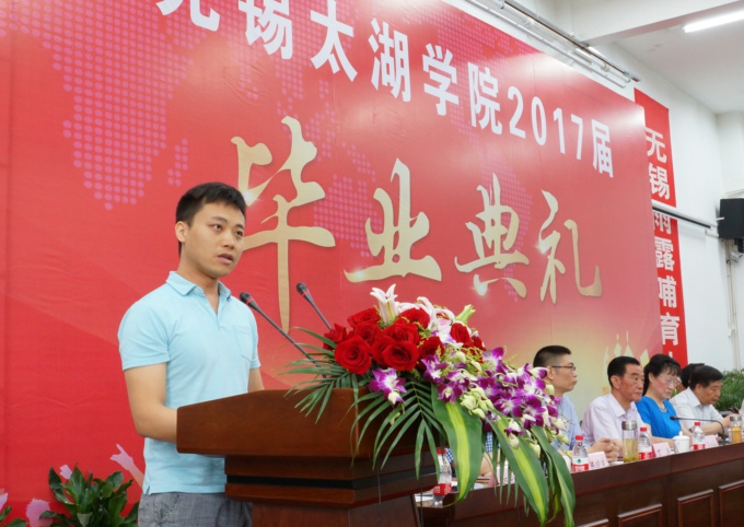 “丰富多彩的太湖校园是一个大熔炉,为我们锻造出与众不同的精彩人生。”2017届毕业生代表、商学院旅游133班的朱思齐上台发言。他说四年的大学生活,收获了青春最美的回忆,收获了最纯真的友谊,收获了勇敢和自信。在这四年中,学校变化非常大,校园美得像公园,公园建在校园里,可以自豪地说,太湖学院是全省最美的大学之一。真诚的话语表达了对母校的眷恋之情、对老师的感激之情,并对学校未来的发展送上了美好的祝愿。