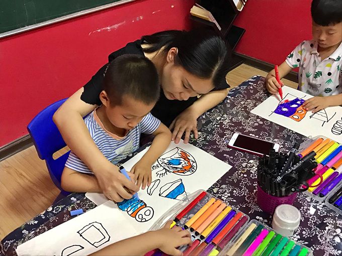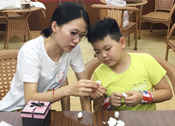 在上海市金山区廊下镇“爱心暑托班”办班点辅导孩子做手工
