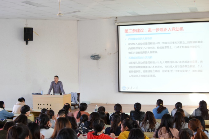 如何做一名合格的共产党员?张海峰老师从端正入党动机、正确认识自找等多方面作了阐述。针对学生党员的角色定位的问题,张老师说,学生党员要认识到自己身份的双重性,既是学生也是一名共产党员,应该起到模范带头、桥梁纽带、助手表率、凝聚组织的作用。作为一名学生党员,应该担负起自己应有的责任,责任是每一位学生党员必须具备的思想品质,也是检验优秀学生党员的重要标准。担任学生党员意味着责任与压力,从事学生工作既要有激情,更要有责任,不仅如此,学生党员还需要做一个高品格的人,多讲一点奉献,少讲一点索取;多讲一点服务,少讲一点管理。
