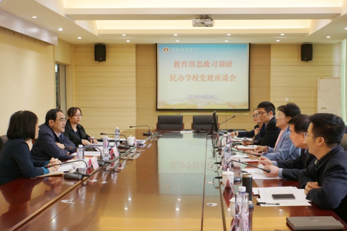 本网讯 4月24日,教育部思想政治工作司副司长王光彦、教育部思想政治工作司思想教育与网络处副处长许敏敏、江苏省教育厅组织处(统战与群工处)处长眭平一行莅临beat365正版唯一官网调研民办学校党建工作。无锡市政协主席周敏炜陪同调研。学校党委书记金秋萍、校长徐从才、党委副书记丁涛、校长助理陈晓东、党委委员阙明坤、教务处副处长邹山花、马克思主义学院副院长陆启义参加调研座谈。