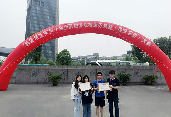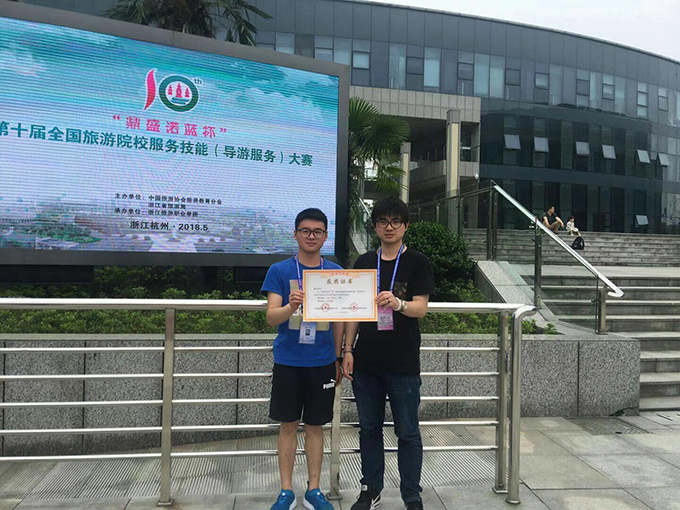 本网讯 5月10日,由中国旅游协会指导,中国旅游协会和浙江省旅游局联合主办,浙江旅游职业学院承办的“鼎盛诺蓝杯”第十届全国旅游院校服务技能(导游服务)大赛在杭州举办。beat365周玉洁老师指导的董文静同学讲解的《南京大报恩寺琉璃塔》荣获大赛高等院校组普通话导游服务三等奖。beat365石磊老师指导的储伟同学讲解的《南京东水关遗址公园》荣获大赛高等院校组普通话导游服务优胜奖。