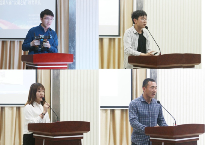 颁奖典礼上,曾获2017年度中央电视台CCTV“希望之星”英语风采大赛全国总决赛大学组三等奖、2016“外研社杯”全国英语阅读大赛一等奖的中共预备党员学习之星徐璨,中共党员、校团委书记学生助理、校学联主席的管理之星惠炜,曾获校综合奖金、第七届华东区大学生CAD应用技能竞赛机械制图个人二等奖等奖项的科研之星倪奕棋,曾获国家励志奖学金、2017年暑期进入镇江文广集团广播中心任实习记者、组建“红色计划”大学生科技文化卫生“三下乡”社会实践活动团队的中共党员实践之星王宇露,曾获无锡市优秀志愿者、校青年志愿者标兵的公益之星周浩,曾任大学生记者团文学部部长兼副团长,荣获获得“第二届大学生读书节”读书遇见更好的世界征文大赛二等奖和讲书大赛二等奖等奖项的写作之星钱亚茹,积极参加校内外各类大型体育赛事活动,曾获欢乐跑中国无锡站青年组第四名,学校第一名的中共预备党员体育之星吴建鹏和曾在“音为太湖”十佳歌手大赛中获得金奖,被评为校三好学生、无锡市三好学生的中共党员才艺之星吴书怡分别进行发言,分享了他们在太湖学院的成长经历,讲述了自己对成长的认识、对理想的追求。