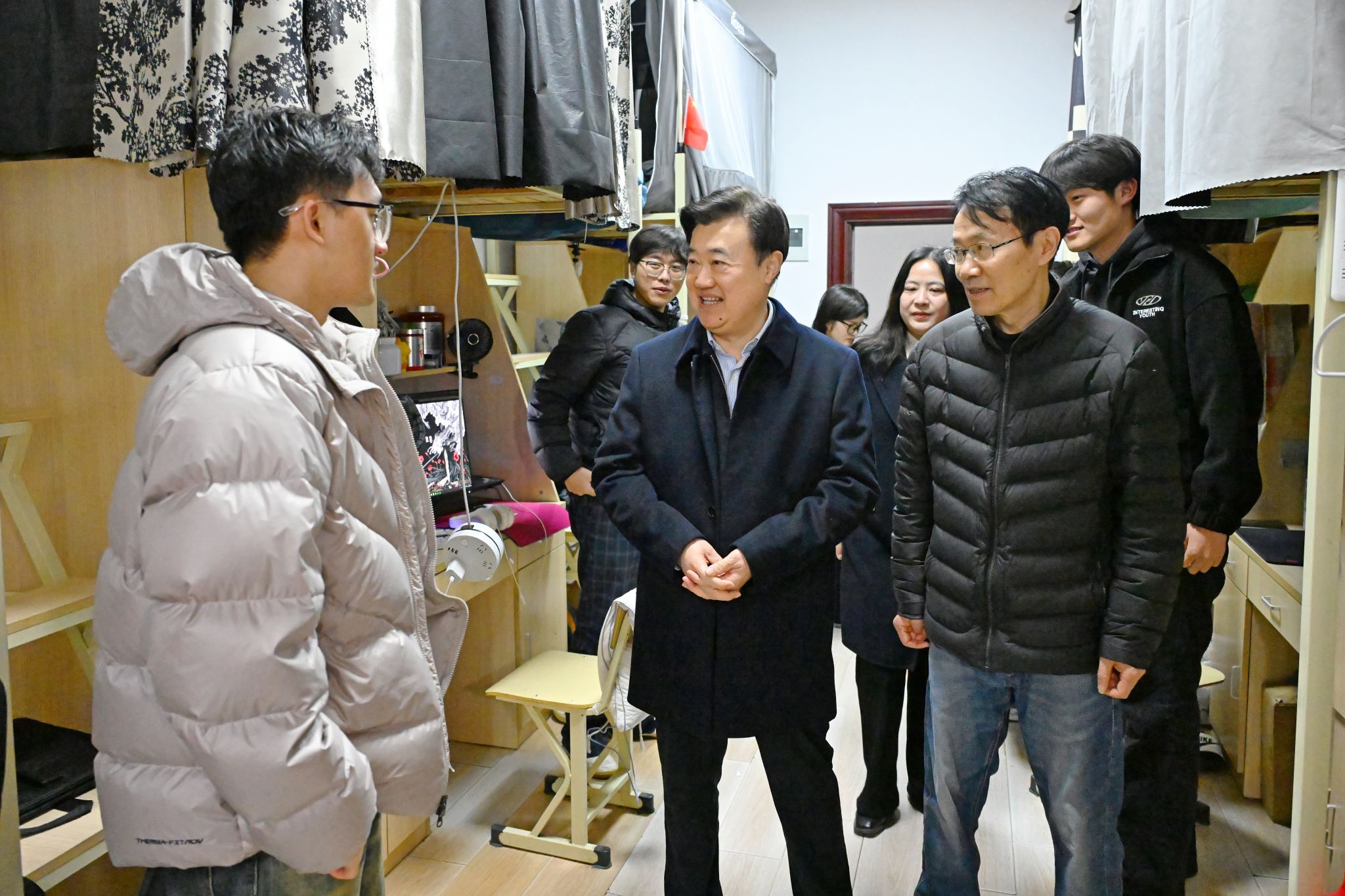 校领导们详细询问了同学们新学期的学习计划、课程进度以及在校生活情况,重点了解了大家在学业发展、职业规划、生活保障等方面遇到的困惑与需求。走访中,校领导强调,同学们要珍惜大学时光,夯实专业基础,积极投身实践,将个人成长与国家发展、社会需要紧密结合;要注重培养健康的生活习惯和积极向上的精神风貌,营造和谐友善的宿舍氛围;遇到任何困难和问题,要及时通过辅导员、学院或一站式学生社区等渠道向学校反映,学校始终是同学们最坚实的后盾。