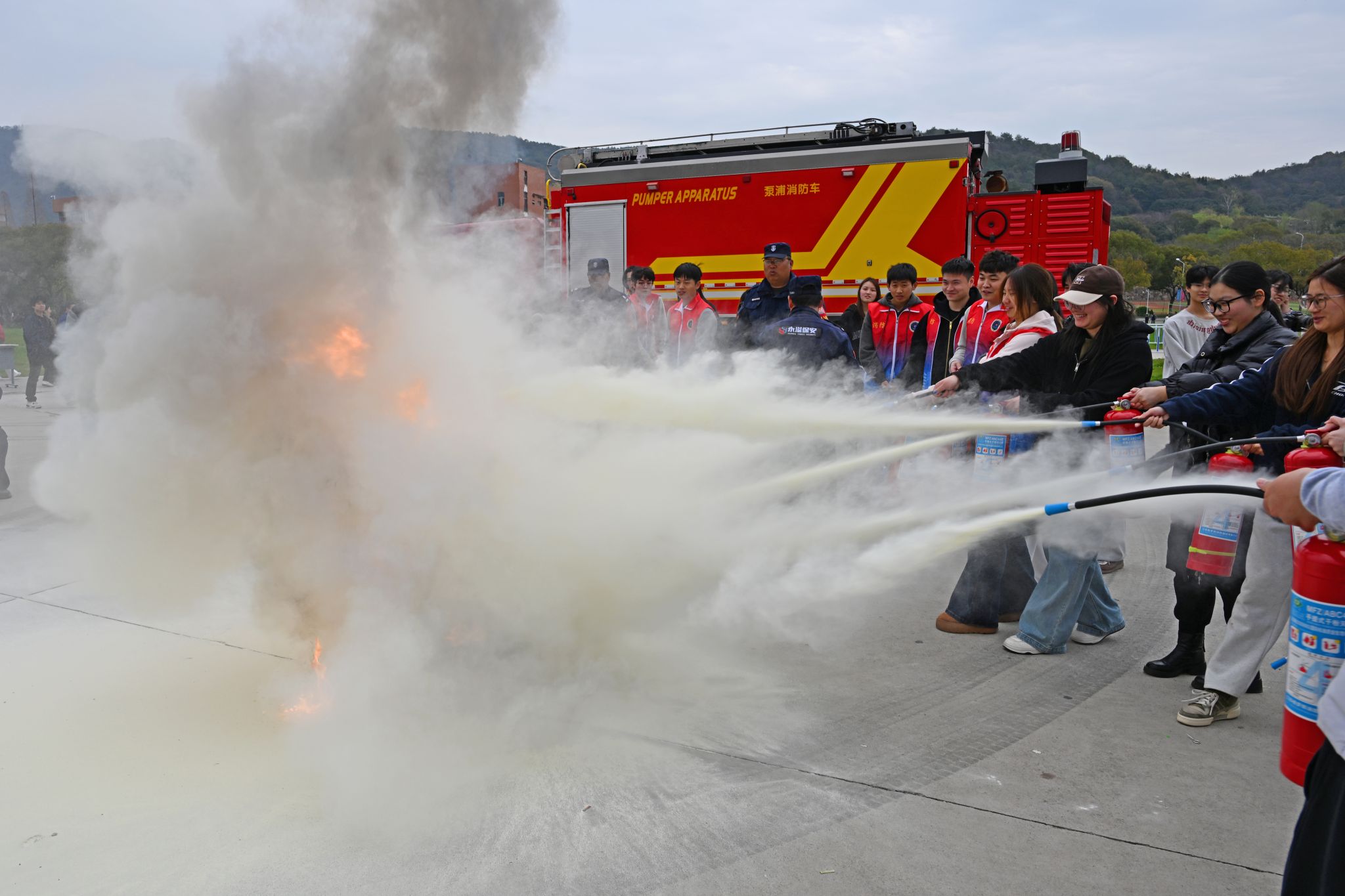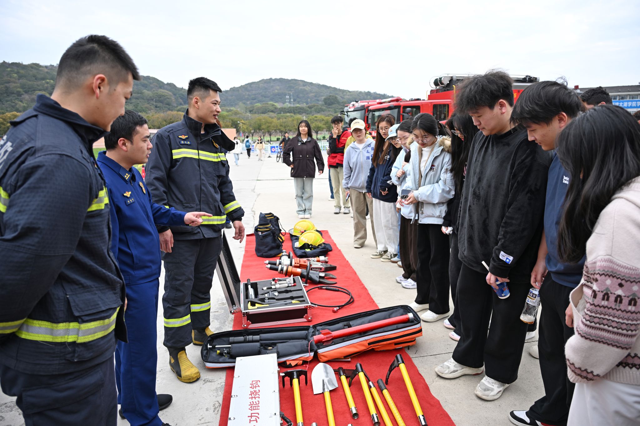 演练环节结束后,活动转入消防安全知识宣教与实操体验阶段。消防指战员结合校园实际和典型案例,为师生详细讲解了火场逃生要点、常见消防器材使用方法和日常防火注意事项。在装备展示与体验区,师生们近距离观摩了各类消防车辆与专业器材,并纷纷上前体验灭火器操作、试穿消防战斗服等环节。通过“听讲解、看演示、亲体验”的方式,师生们对消防安全有了更为深刻和感性的认识,掌握了实用的消防技能。