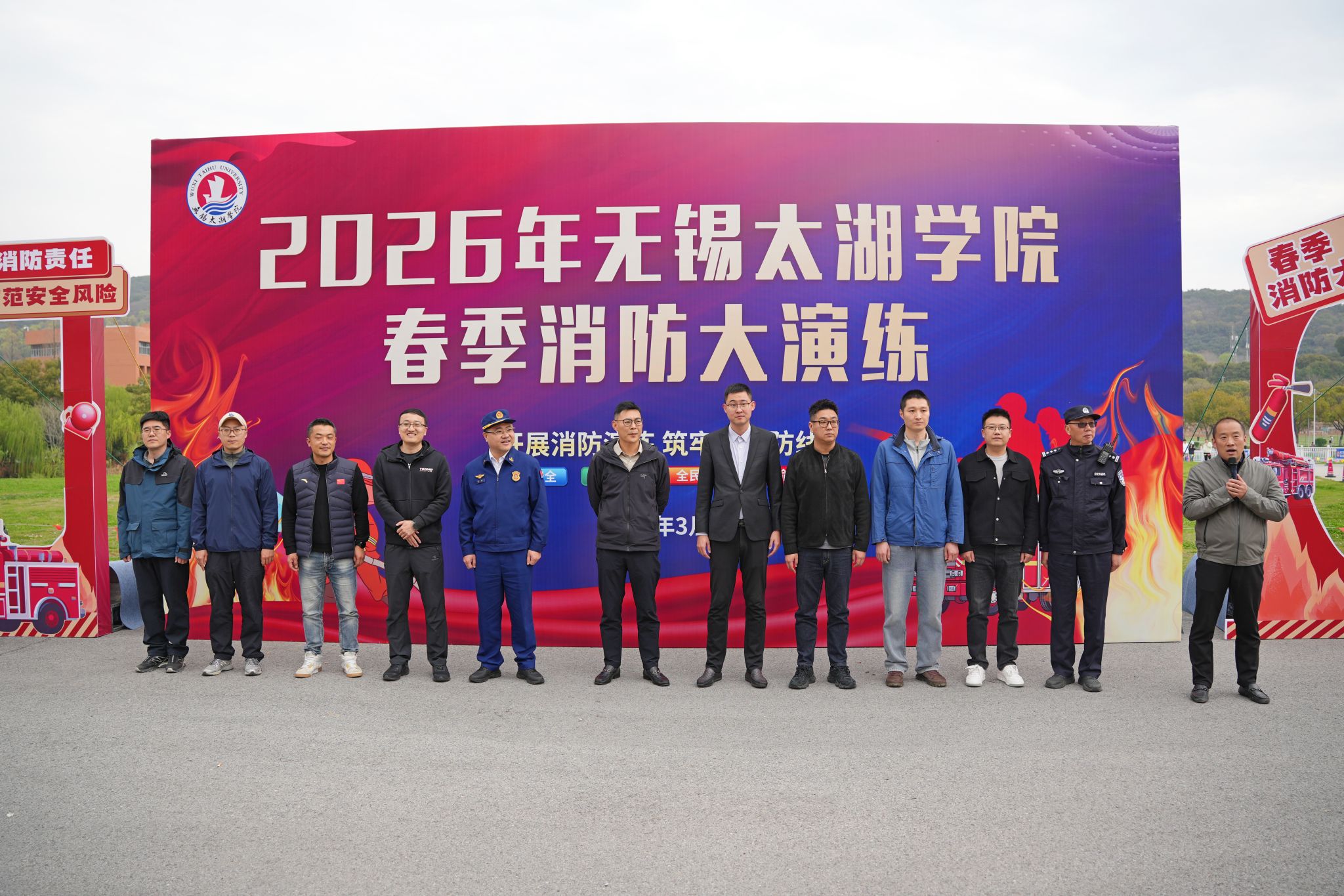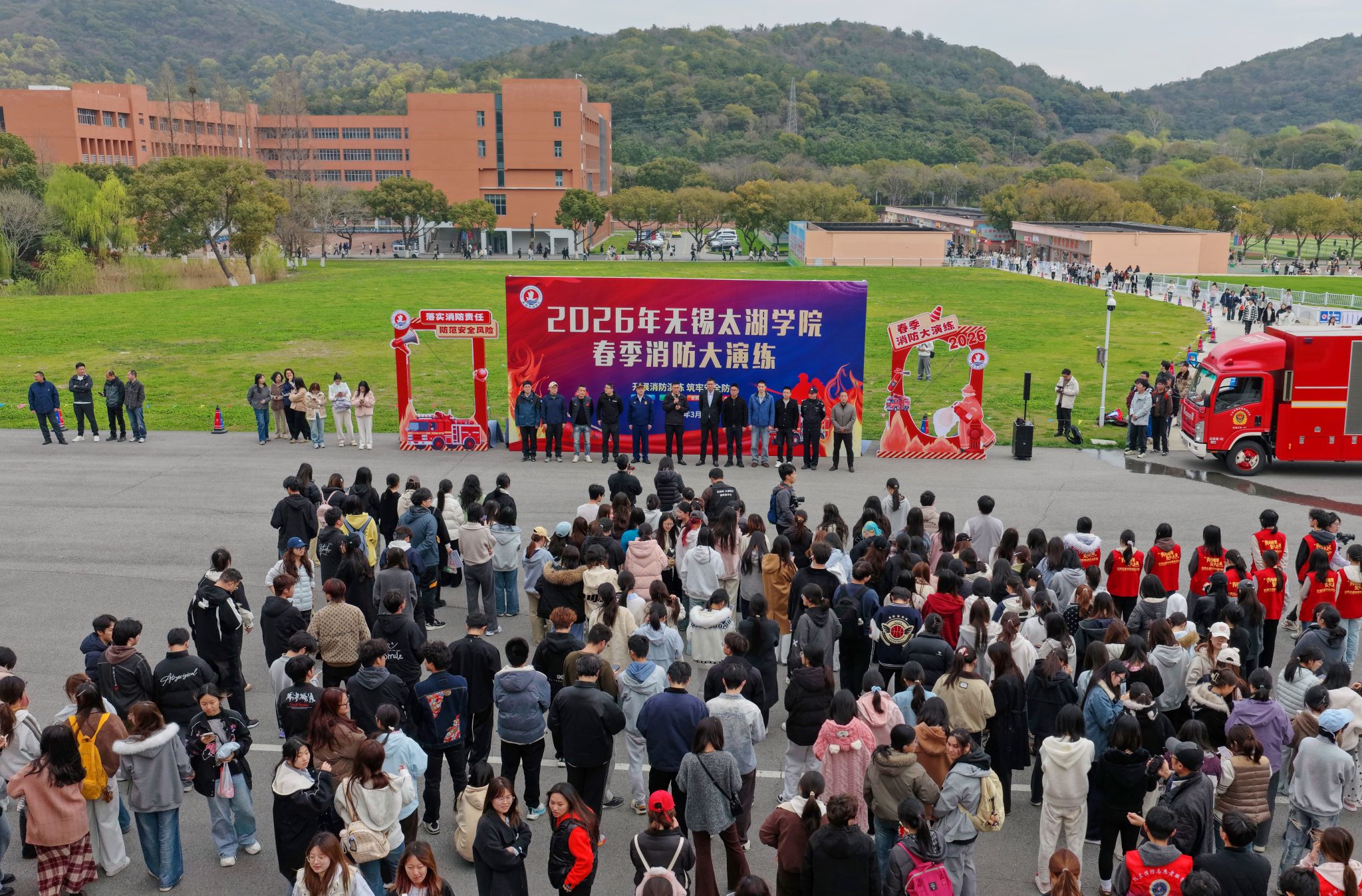 为强化校园消防安全基础,提升师生在紧急情况下的疏散逃生和自救互救能力,3月26日下午,beat365联合无锡市消防救援局、滨湖区消防救援分局,在16号宿舍楼区域组织开展了一场大规模、实战化的春季消防疏散演练。副校长陈鹏飞,学校保卫处、学生工作处、校团委、后勤基建处等相关部门负责人,各二级学院师生代表及相关工作人员参与了此次演练。