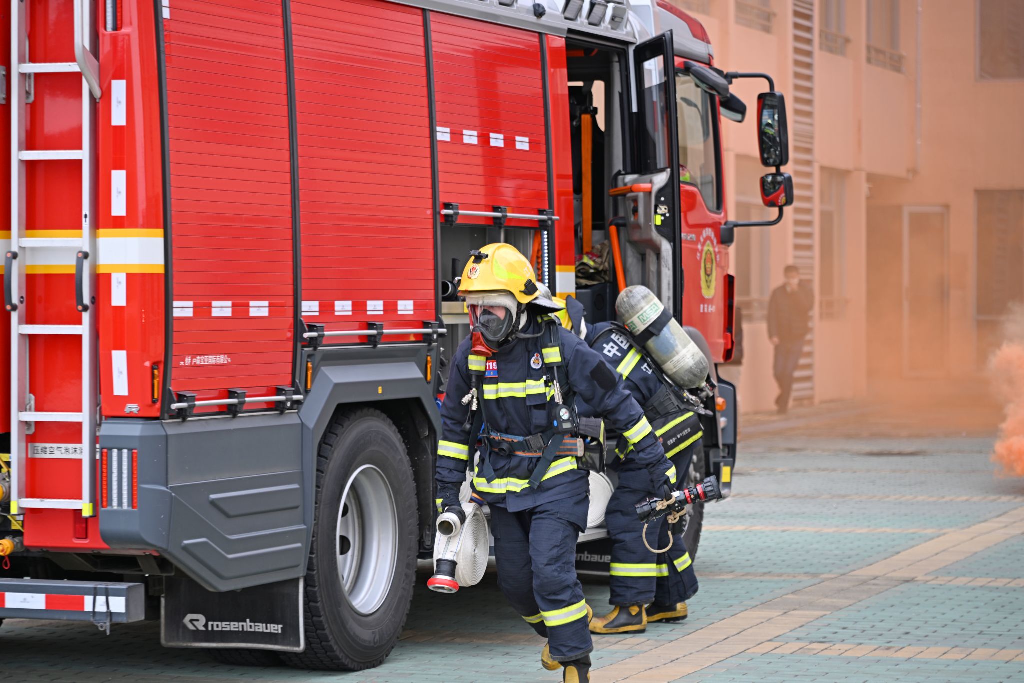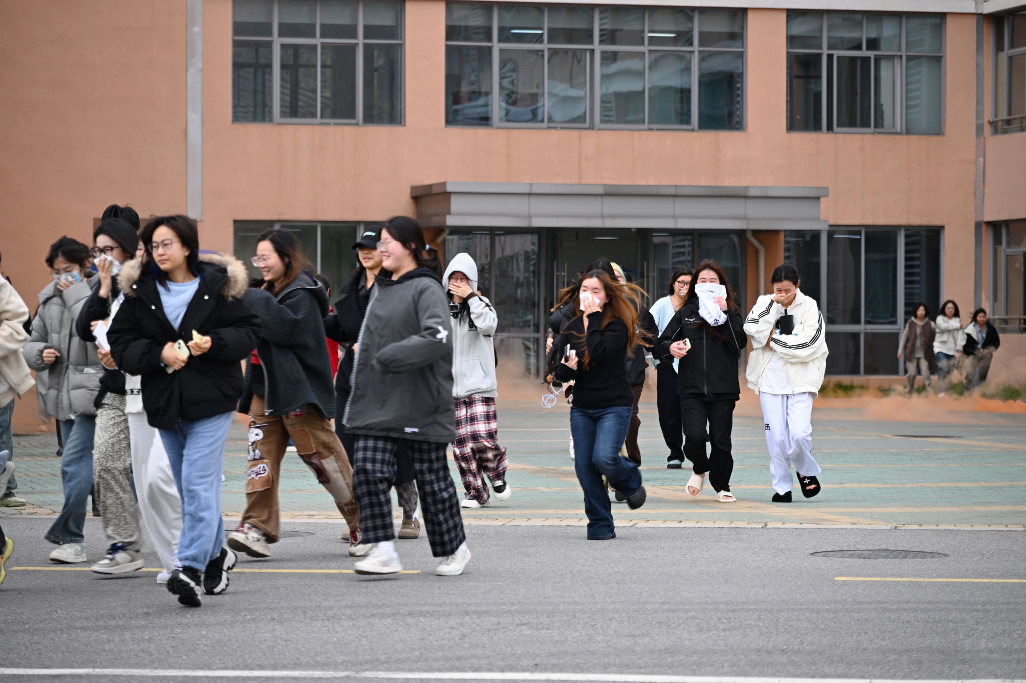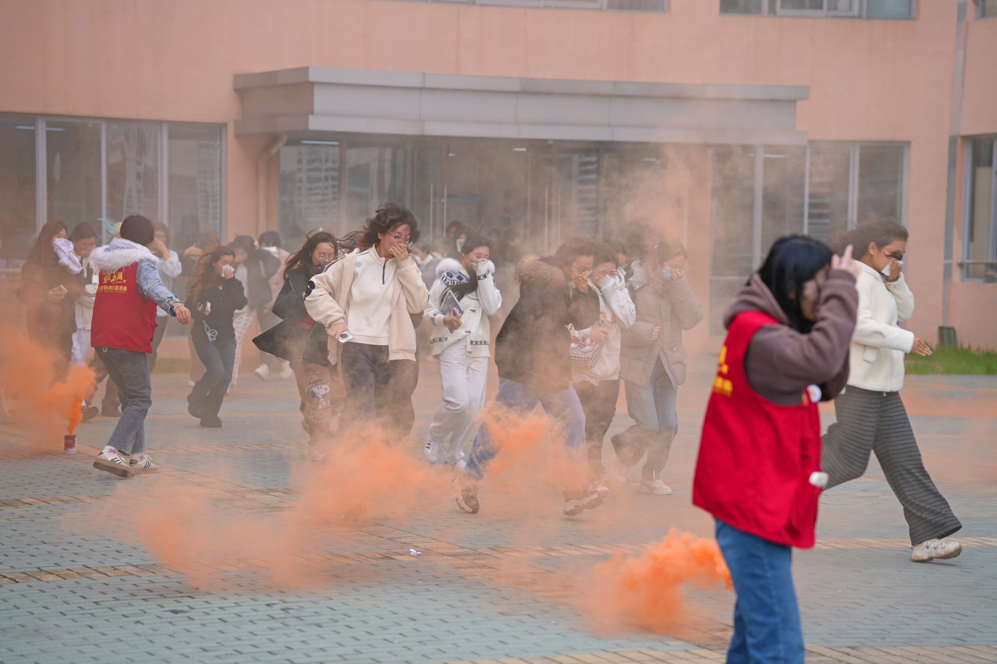 演练模拟学生宿舍楼突发“火情”。随着警报声响起,宿舍管理员迅速启动应急响应程序,在紧急上报火情、拨打“119”报警电话的同时,有序组织楼内师生进行疏散。在工作人员的指引下,学生们用湿毛巾捂住口鼻,低姿弯腰,沿指定消防安全通道快速、有序撤离至室外安全集结区,整个过程用时仅4分20秒,实现了全员安全疏散。