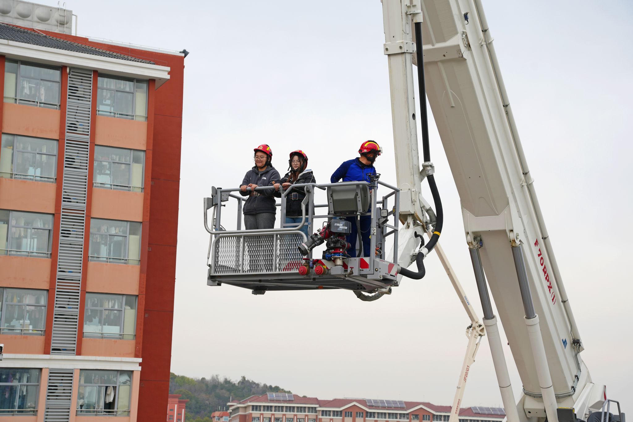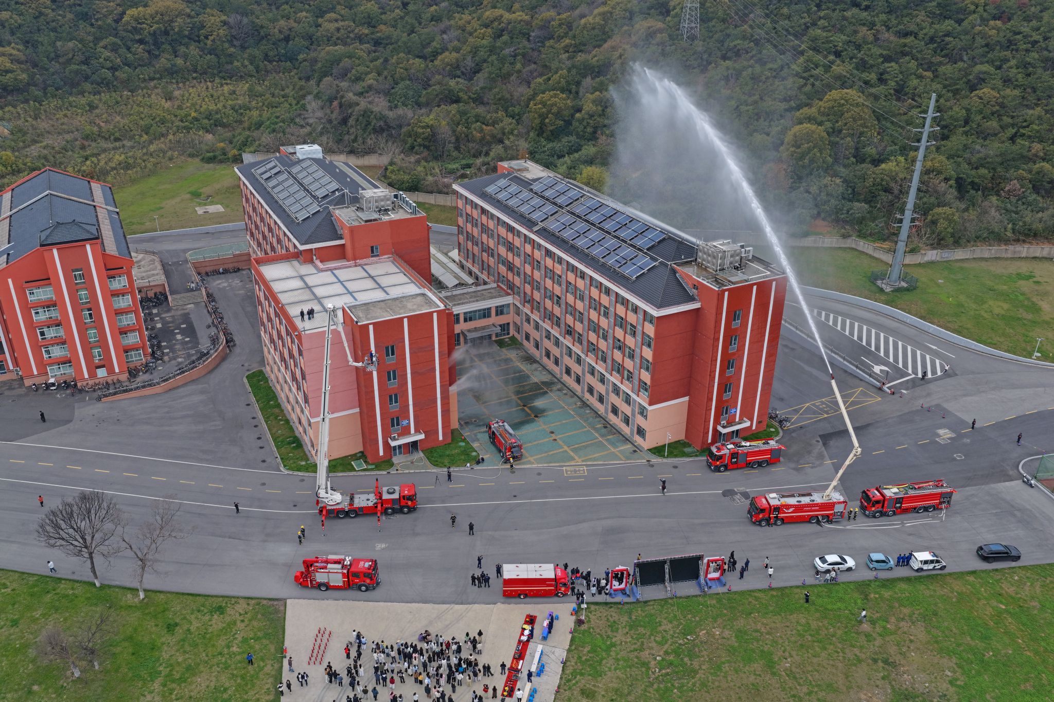 消防救援力量接警后迅速抵达现场展开专业处置。演练中,无人机升空侦察,实时回传火场画面;压缩空气泡沫消防车与建筑内部消防设施联动,对“火点”进行压制;70米登高平台消防车成功“解救”高层“被困人员”;多节臂高喷消防车在外围形成立体水幕,协同完成“灭火”总攻。消防救援人员展示出的精湛技能和先进装备,让现场师生直观感受到了现代化消防救援的强大战斗力。