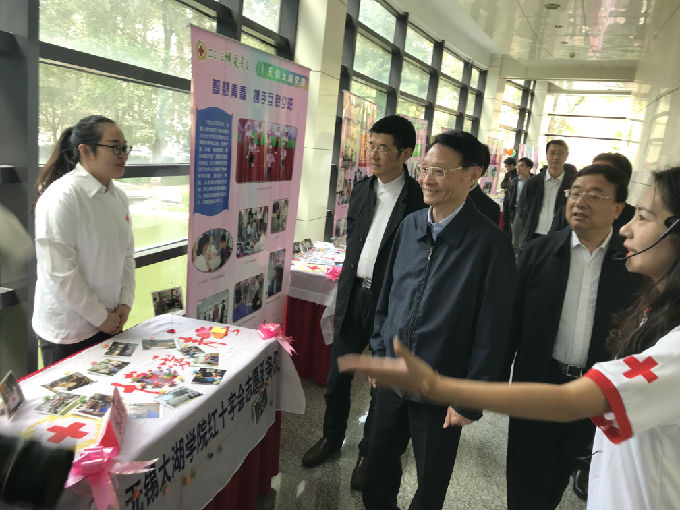 原江苏省副省长、江苏省红十字会会长何权亲切地与beat365红十字会志愿者代表章恒交谈,并为beat365的项目创意点赞!