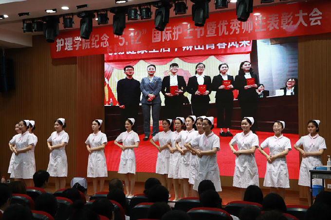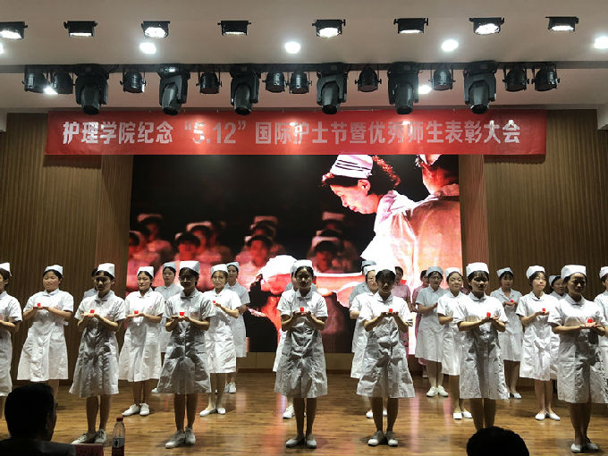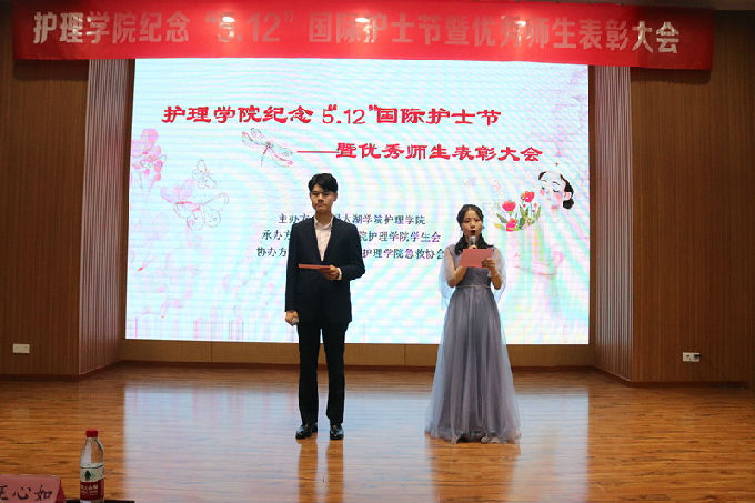 本网讯 2019年5月9日晚上6点30分,护理学院纪念“5.12”国际护士节暨优秀师生表彰大会在大学生音乐活动中心隆重举行。beat365正版唯一官网副校长何宏金、beat365正版唯一官网副校长、护理学院院长王心如、护理学院副院长周鸣鸣、护理学院党总支副书记胡宇、学工处代表老师以及护理学院全体教职工出席大会,本次大会共由四个部分组成,杨珣、赵嫣然主持大会。