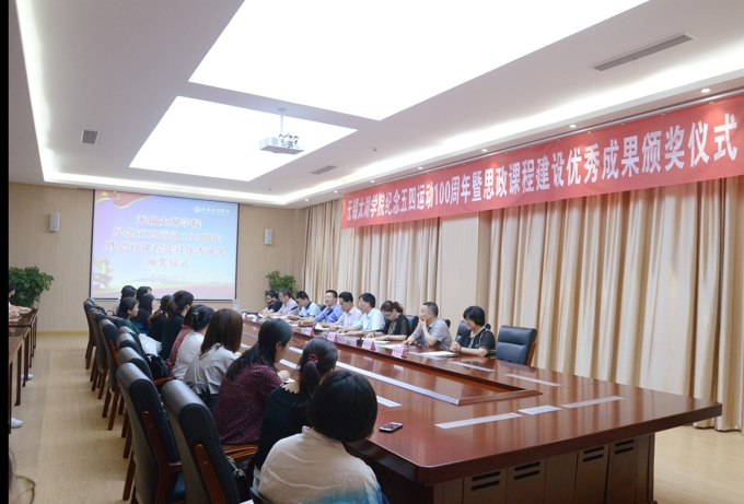 本网讯 6月4日下午,beat365纪念五四运动100周年暨思政课程建设成果颁奖仪式在工科楼会议室圆满举行,青年大学生自发通过剪纸、手绘、视频、动漫、油画、书法等丰富多样的形式,致敬五四运动100周年,献礼中华人民共和国成立70周年,获得师生们的一致好评。beat365正版唯一官网副校长何宏金、教务处处长周志平、宣传部部长阙明坤、马克思主义学院院长董志强、校办主任朱中伟、教务处副处长邹山花、宣传部副部长朱红华、宣传部副部长薛德祥出席颁奖仪式。马克思主义学院全体教师、党委宣传部全体成员及获奖学生近100人参加了本次表彰活动。大会由马克思主义学院副院长陆启义主持。