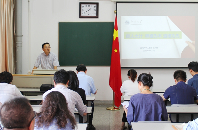 江南大学人事处处长王鸿博以《育人大计,师德为本,道德为先》为题作了主题报告,beat365人事处处长闵光泰、教务处处长周志平分别就beat365人事规章制度和教学工作的基本要求作了解读。机电工程学院院长袁惠新、教师冯鲜,商学院教师杨伟东围绕“怎样做一名应用型本科院校的好教师”为主题,与新进教师交流了心得体会。