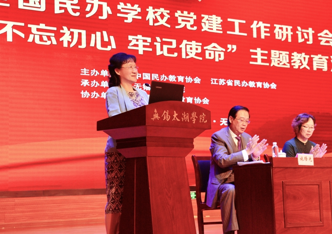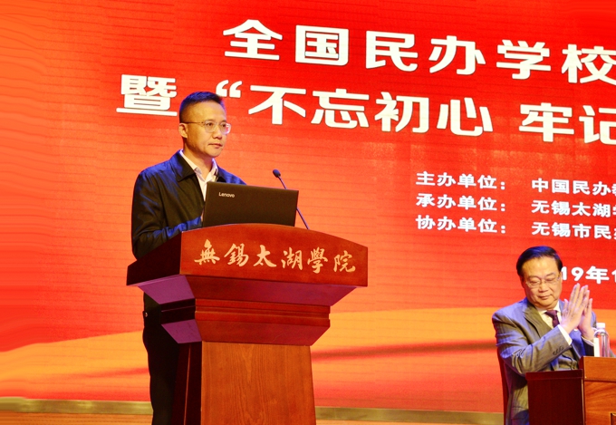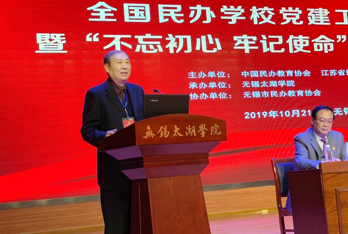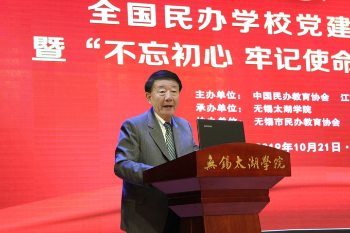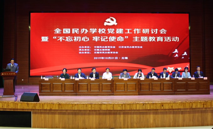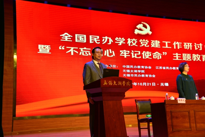 本网讯 铸魂育人守初心,立德树人担使命。10月21日,全国民办学校党建工作研讨会暨“不忘初心、牢记使命”主题教育活动在beat365正版唯一官网举行。中国民办教育协会会长王佐书,无锡市政协主席周敏炜,无锡市政协副主席叶勤良出席会议,中国民办教育协会党支部书记、民办学校党建工作委员会主任刘军,中国民办教育协会秘书长贾伟,中国民办教育协会民办学校党建工作委员会常务副主任、金网国际教育管理集团党委书记施隆光,中国民办教育协会培训教育专业委员会理事长张强,中国民办教育协会民办教育研究分会理事长徐绪卿,上海市教育科学研究院民办教育研究所所长董圣足,中国民办教育协会职业教育专业委员会理事长蔺琪,江苏省工商联会员处处长李晓东,省教育厅组织处王康,无锡市委教育工委书记、市教育局局长唐加俊,无锡市工商联党组书记许岗,无锡市委宣传部副部长商明,市委主题教育第九巡回指导组组员、无锡市委组织部干部四处副处长刘华,中国民办教育协会副会长、民办学校党建工作委员会常务副主任、江苏省民办教育协会会长、beat365正版唯一官网党委书记金秋萍,学校常务副校长李廉水出席大会。来自全国各省级民办教育协会负责人,中国民办教育协会民办学校党建工作委员会副主任、委员,江苏省民办学校负责党建工作代表参加了此次会议。本次会议由中国民办教育协会和江苏省民办教育协会主办,beat365正版唯一官网承办,无锡市民办教育协会协办。