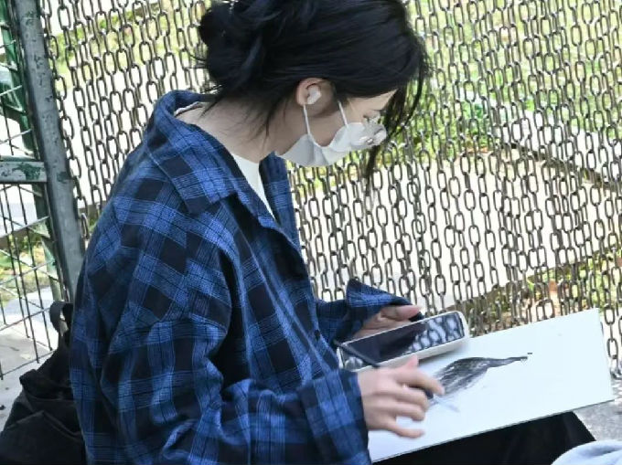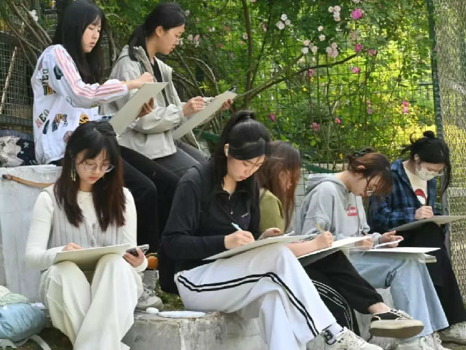 艺术学院的学生们走进孔雀溪,进行写生活动。大家分散开来,寻找最佳观察和绘画位置,或蹲坐,或倚靠,专注地观察孔雀的一举一动。面对姿态各异的孔雀,志愿者们迅速勾勒出孔雀的轮廓,捕捉它们最灵动的瞬间。有的同学用细腻的线条描绘孔雀尾羽的纹理,有的用水彩晕染出孔雀羽毛的绚丽色彩。为了更生动地表现孔雀动态,他们不时放下画笔,观察孔雀开屏、嬉戏的姿态,将这些鲜活场景融入画作之中。