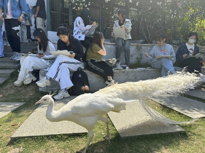 当天的签约活动标志着双方合作的正式启动。活动现场,艺术专业的学生们深入无锡动物园孔雀溪畔,展开写生活动,捕捉园区内鸟类的生动形象。孔雀的华丽羽毛、天鹅的优雅身姿、仙鹤的灵动舞步,纷纷定格在同学们的画纸上,展现了他们对自然美的独特理解与艺术创作能力。