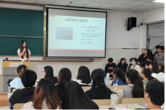 接下来,往届获奖学生代表齐玥同学上台分享参赛获奖经历与心得体会。她从个人成长的角度出发,鼓励在场同学充分发掘自身潜力,积极参与比赛,借助比赛检验个人综合能力与素养,为未来职业生涯的规划提供更多的视角与可能。