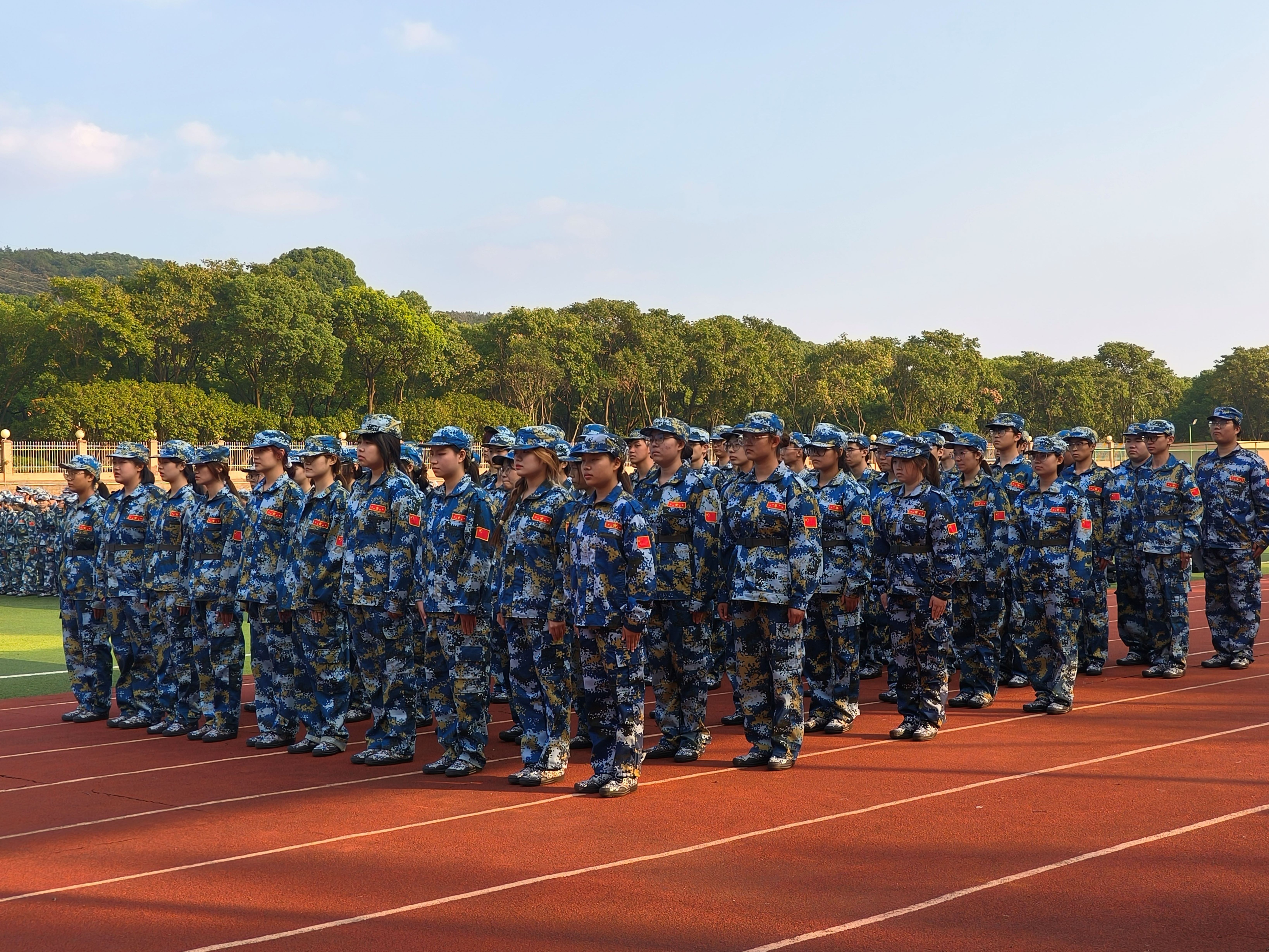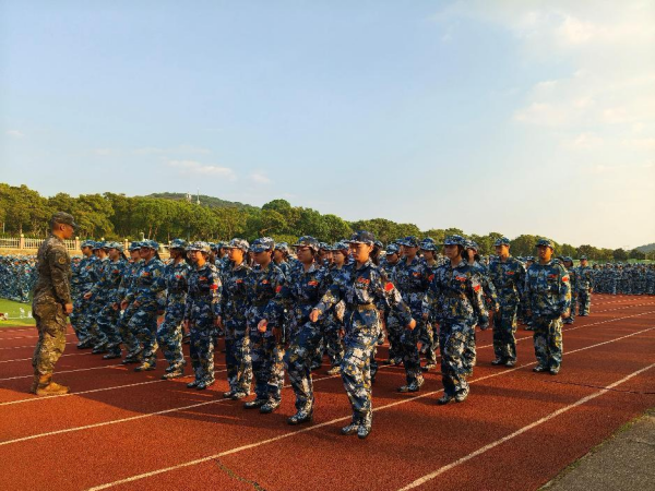 秋风吹过少年的脸颊,也吹动了青春的篇章,那一抹抹动人的海蓝色在田径场上汇成了蓝色的海洋。昂首挺胸,斗志昂扬,每个人都以笔直的身姿迎接新一天训练的到来。在教官的严格要求和悉心教导中,同学们从最初的生疏变得整齐划一,以饱满的热情投入军训中,迷失在呐喊中的挥汗如雨,沉浸在秋日里的风和日丽。