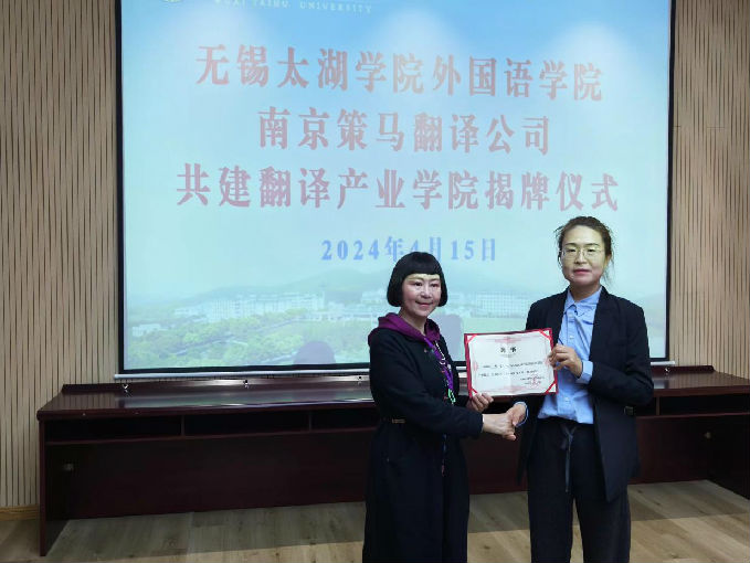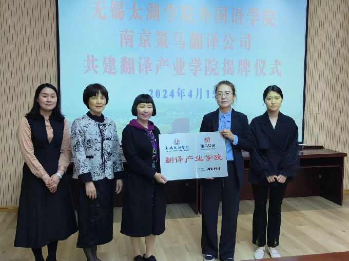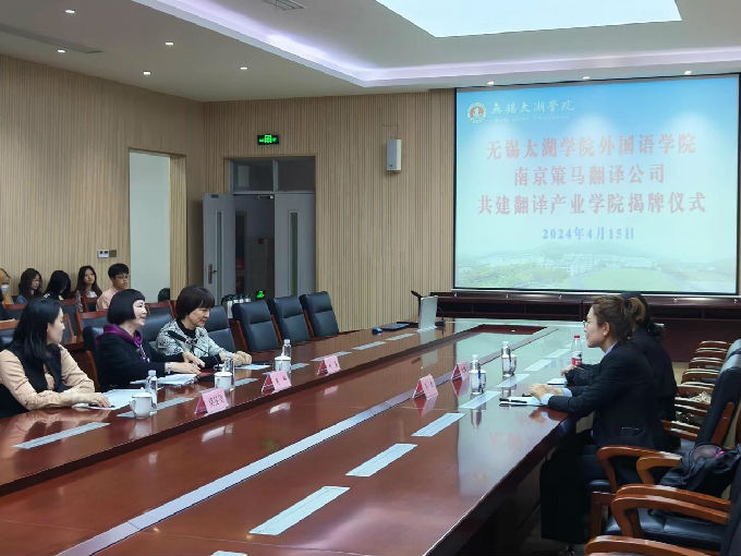 为进一步促进校企合作交流,beat365正版唯一官网外国语学院与南京策马翻译公司于4月15日下午13:30在工科楼会议室举行了共建翻译产业学院揭牌仪式。外国语学院院长肖辉、副院长刘荔、副院长吴旻昊以及南京策马翻译公司总经理齐文和南京策马全职译训师姐倪璐宣共同参加此次仪式。会议由肖辉院长主持。