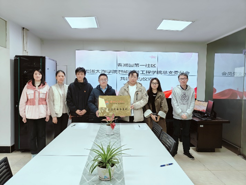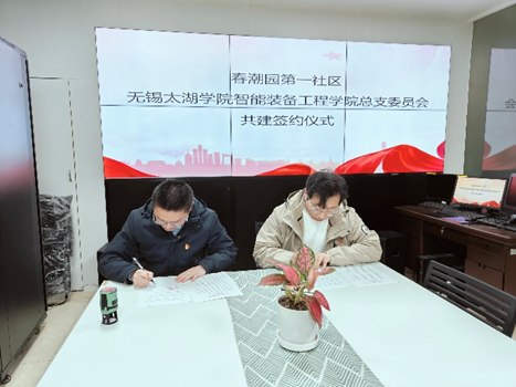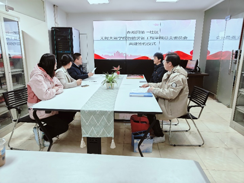参与此次签约仪式的有春潮园第一社区党委书记张立、智能装备工程学院团总支书记张传博、社区工作人员以及学生代表。