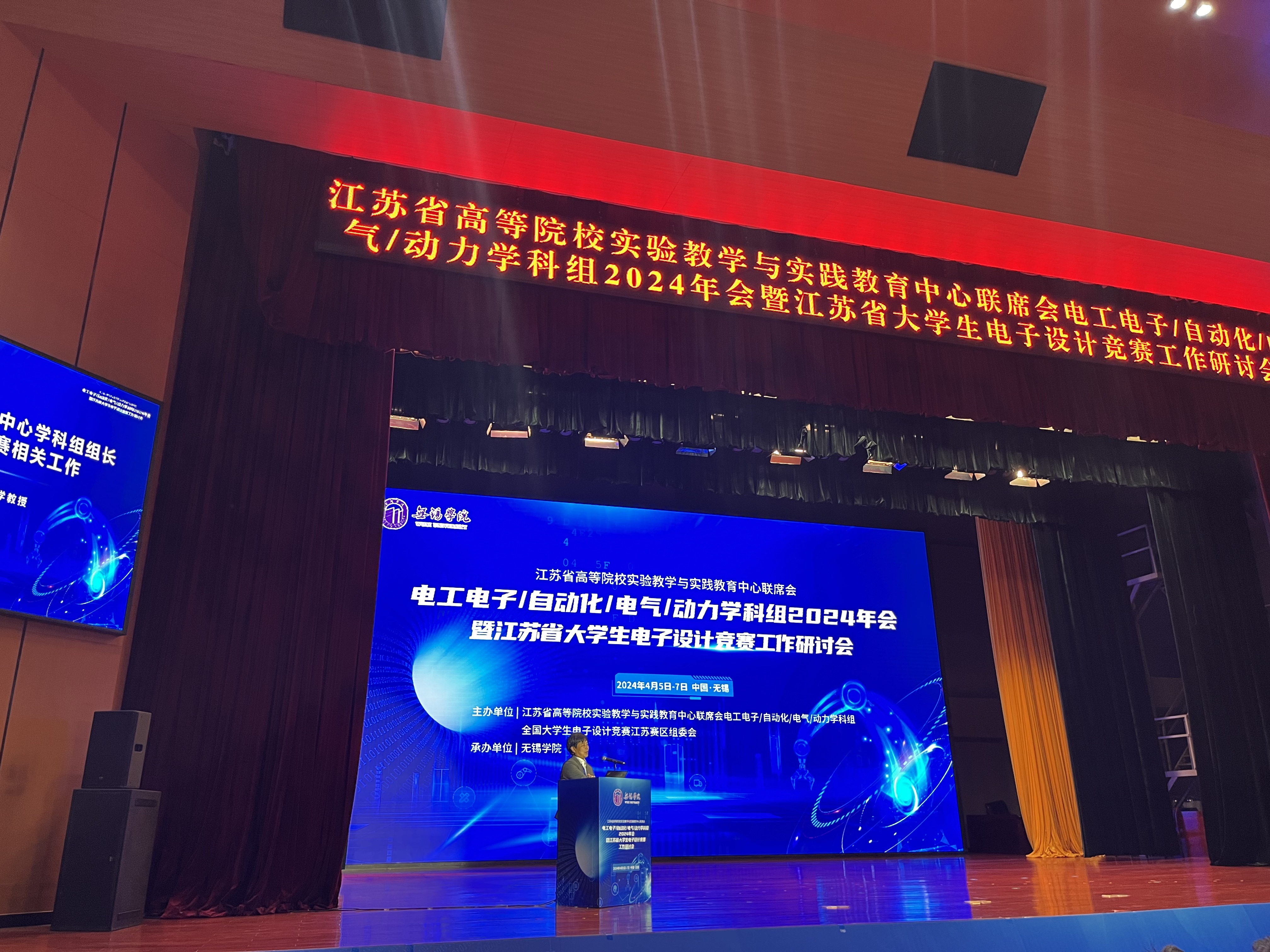 江苏省实验教学示范中心学科组组长、全国大学生电子设计竞赛江苏赛区组委会秘书长兼专家组组长、东南大学胡仁杰教授,无锡学院校长张永宏教授出席会议并致辞。会议还邀请了浙江大学潘再平教授、无锡学院郭业才教授、南京航空航天大学雷磊教授、南京信息工程大学庄建军教授、南京信息工程大学刘恒教授、南京邮电大学陈建飞副教授等专家为大会作主题报告,分别以电力电子技术与电子设计竞赛、学科竞赛驱动下的创新能力培养探索、无人机集群数字化实践教学体系构建、高阶实验教学项目探究-以信号分解与合成为例、基于产教融合的学科竞赛指导和教学案例建设实践探索、电子设计竞赛常态化渐进式培训模式(电源类)等主题,以及2024年江苏省大学生电子设计竞赛发展趋势及工作安排等相关事宜开展交流研讨,部分实验仪器厂商负责人也在现场开展技术咨询和产品展示活动。