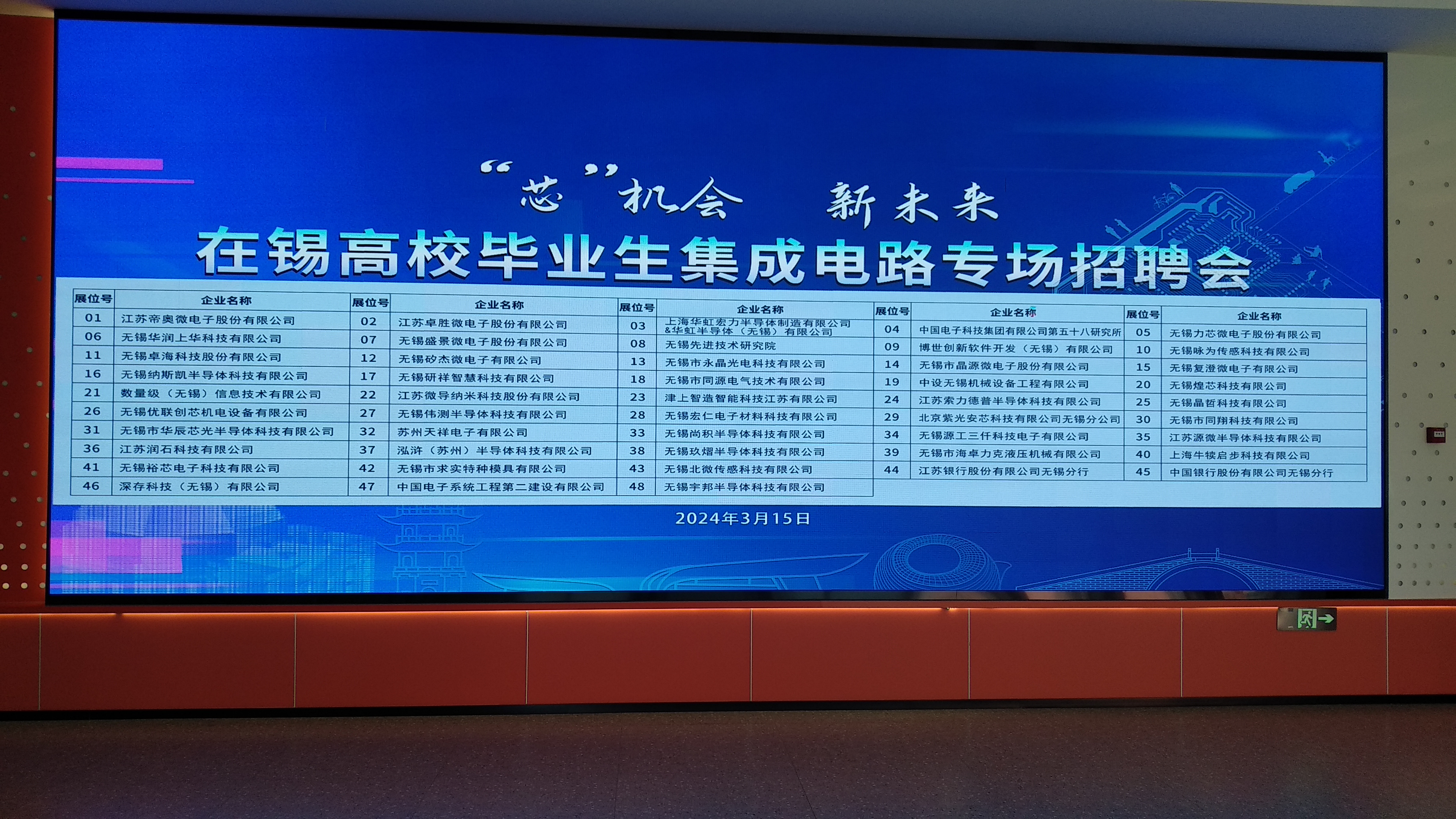此次招聘会邀请到40多家无锡市重点企事业单位参与,包括中国电子科技集团有限公司第五十八研究所、江苏帝奥微电子股份有限公司、江苏卓胜微电子股份有限公司、无锡力芯微电子股份有限公司等一流企业,涵盖机械、电子信息、自动化、计算机等多个领域。