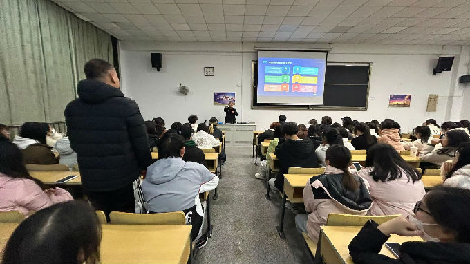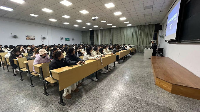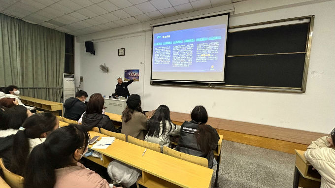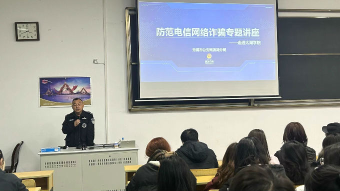首先,警官以会仪开始前一个小时发生在太湖学院的诈骗事件引入主题,让同学们近距离感受到电信诈骗的存在并对诈骗有了更多的了解。