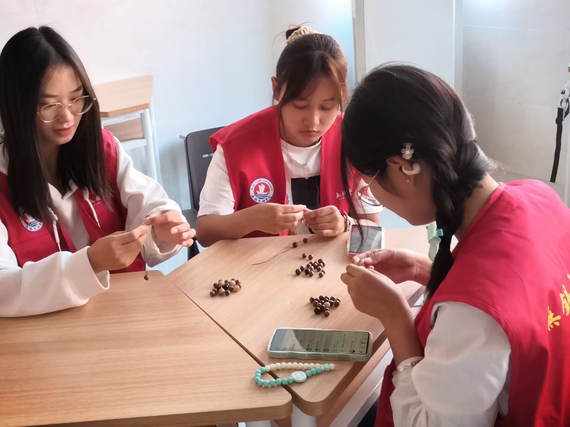 10月22日下午,在前往养老院之前,工作人员向参与同学发放了发放了串珠的材料,随后对手工串珠的基本制作方法、饰品颜色的搭配以及串珠组合的基本方法进行讲解。小小的串珠寄托了同学们对老人的满满情谊。