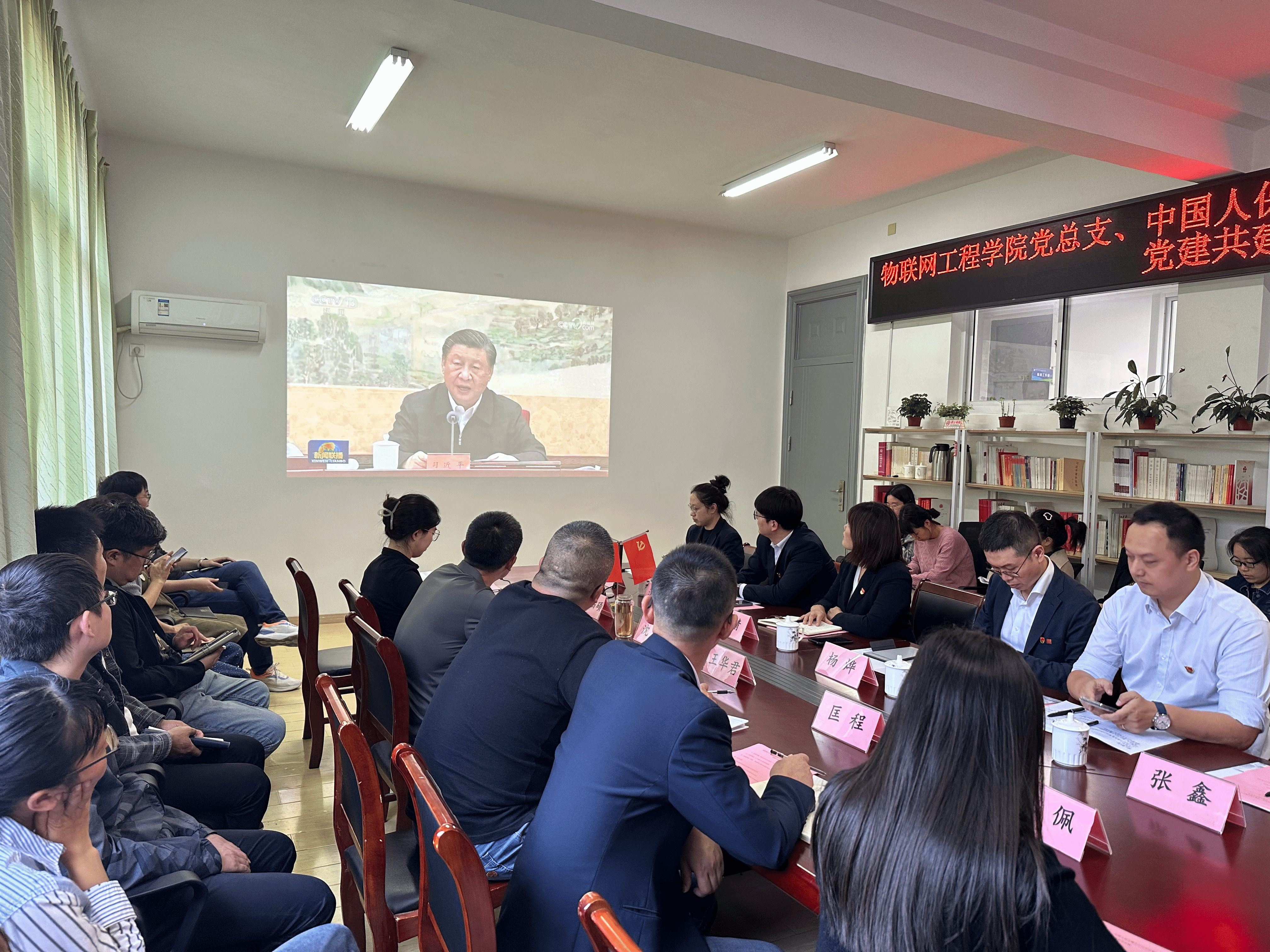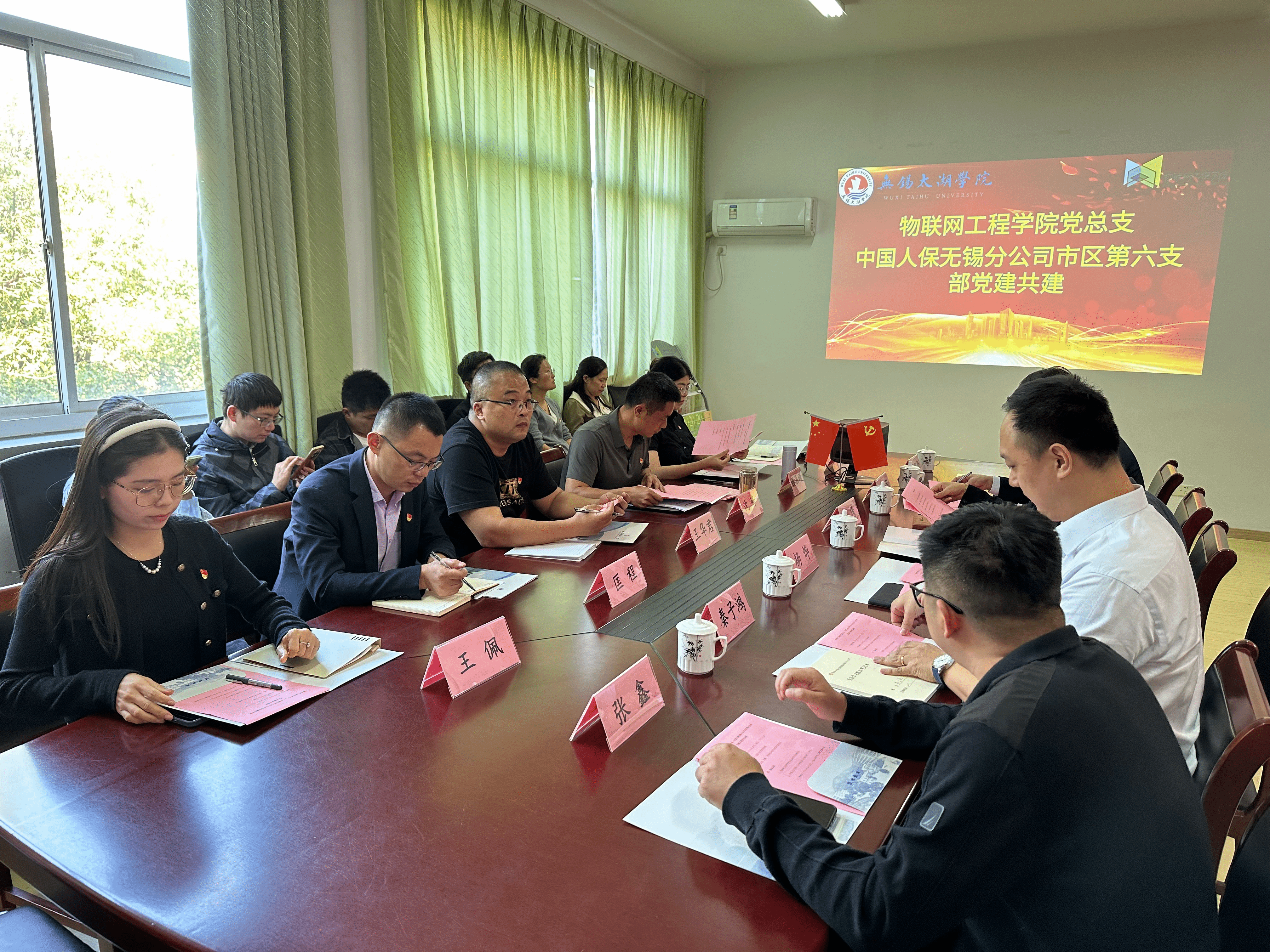 会议首先由物联网工程学院党总支副书记沈峰致欢迎词,沈书记对中国人保无锡分公司市区第六支部党员同志们的到来表示欢迎,接着介绍了学院在学科建设和人才培养方面的一些情况。然后中国人保无锡分公司市区第六支部书记王倩对沈书记的欢迎表示感谢,并介绍了中国人保无锡分公司的基本情况。