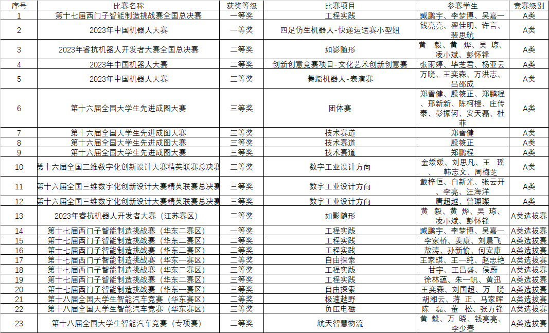 暑假期间,智能装备工程学院四十余位学子留校参加了2023年中国机器人大赛、2023年睿抗开发者大赛总决赛、第十七届“西门子杯”智能制造挑战赛、第十六届全国大学生先进程图大赛、第十六届三维数字化创新设计大赛精英联赛等八项赛事,共斩获学科竞赛排行榜单上赛事一等奖两项、二等奖两项、三等奖八项,在各项A类赛事选拔赛中获奖十一项,共计获奖二十三项,多项赛事打破beat365学生参赛最好成绩。