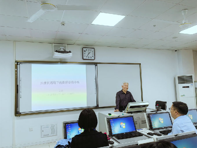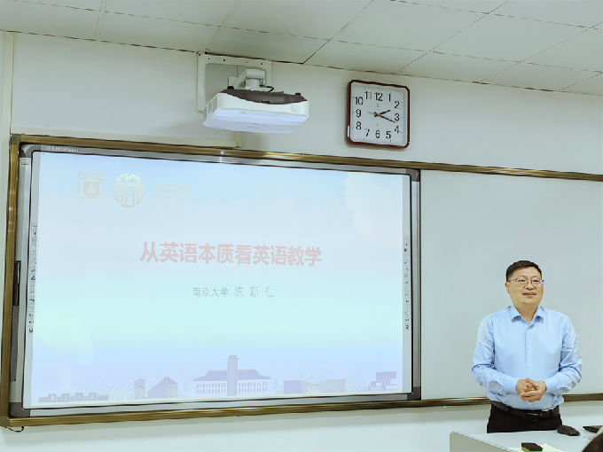 2023年5月17日下午,我院有幸邀请到江苏省外国语言学会会长、南京师范大学辛斌教授和语用学专业委员会会长、南京大学陈新仁教授来校,在工科实验大楼A313为我们带来了精彩的学术报告,为我们的教学研究和教学实践提供了新的方向与视角。报告由常务副院长肖辉主持,副院长吴旻昊及各专业教师参加,共同挖掘教学本质,谋求更高水平的教学质量与效果。