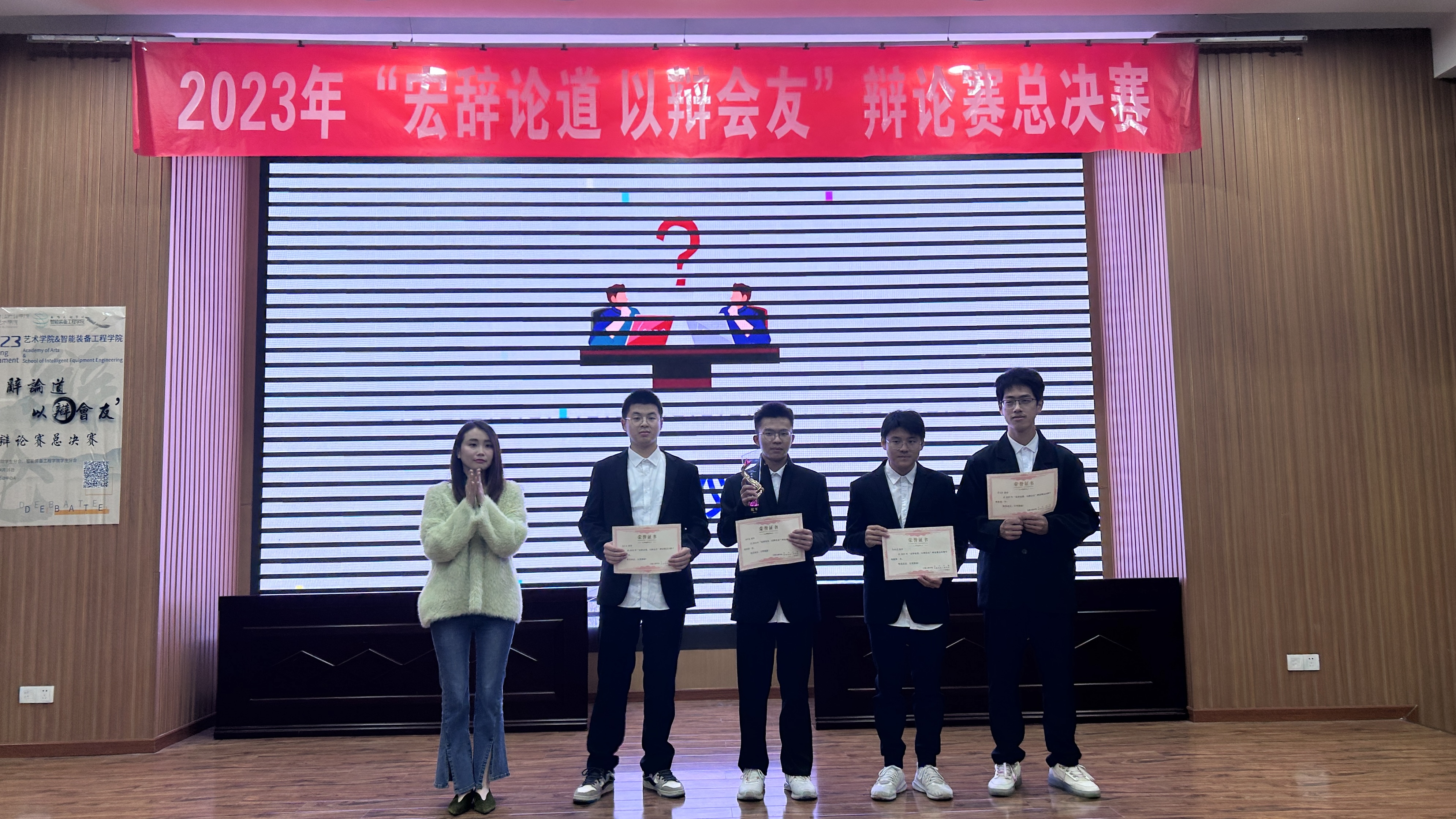 4月16日晚,智能装备工程学院与艺术学院于大学生活动中心A共同举办了“宏辞论道,以辩会友”辩论赛总决赛,本次决赛由智能装备工程学院团总支书记丁苗,健言社负责人陈海娜,智能装备工程学院学生分会负责人刘晨飞,艺术学院团总支副书记孙杰,学工助理团组长孙方成及学生分会负责人宋子瑶担任评委。本次活动由马建同学主持。