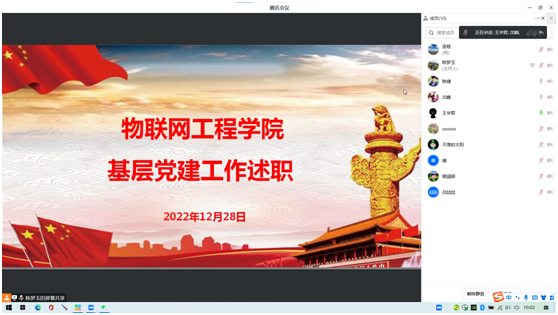 根据校党委统一部署,物联网工程学院党总支于2022年12月28日上午10点通过腾讯会议举行党支部书记述职会议,会议由党总支副书记沈峰同志主持,党总支各委员、各支部书记参加了此次会议。