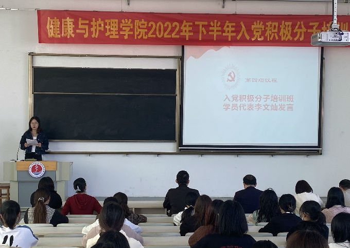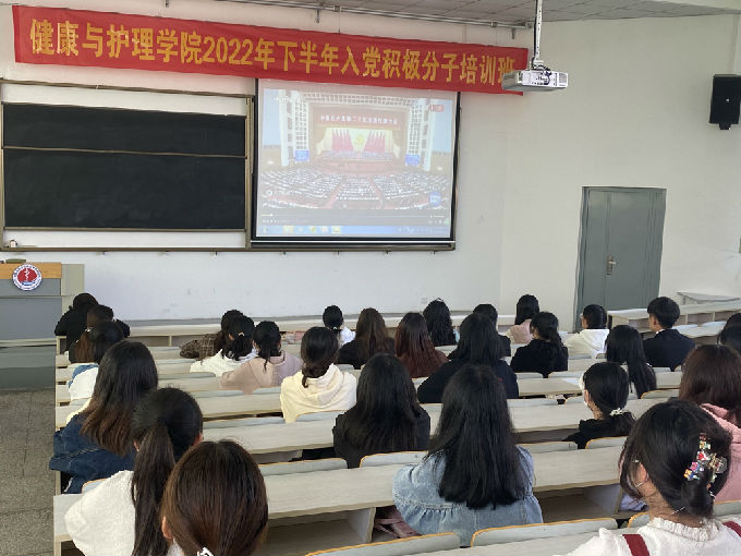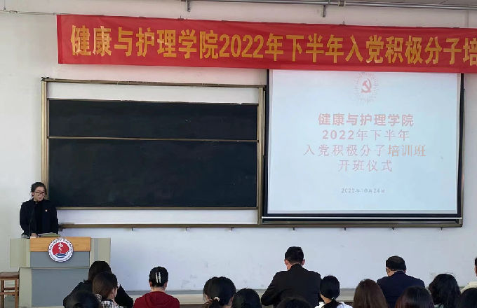 为深入贯彻落实习近平总书记在党的二十大的重要讲话精神,推动我院党建工作深入开展。2022年10月24日中午12点15在5号楼318教室顺利开展2022年下半年入党积极分子培训班开班仪式。本次开班仪式由健康与护理学院学生党支部书记陈春晓老师主持,校党委委员、健康与护理学院副院长周鸣鸣院长、健康与护理学院党总支副书记胡宇书记、健康与护理学院院长助理宋绍征博士、健康与护理学院党总支委员和2022年下半年入党积极分子参与。