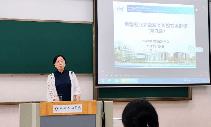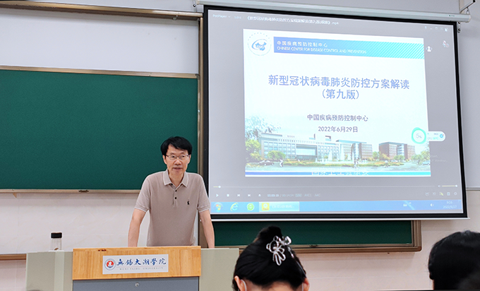 武蓓蓓副书记带领全院教师共同学习《新型冠状病毒肺炎防控方案解读(第九版)》。首先,武书记结合学校校情和自己分管的工作,向全体老师详细剖析了新型冠状病毒肺炎防控方案(第九版)的重要内容,要求每位老师认真学习、贯彻执行,强化风险意识,提升常态化疫情防控和应急处置能力。其次,武书记分享了上学期疫情期间学院管理层严于律己、服从安排做好疫情防控各项工作的先进事迹。最后,武书记就近期教职工返校流程及每日健康打卡等具体事项进行了详细说明,督促老师们遵照执行、做好自身健康管理的第一责任人。
