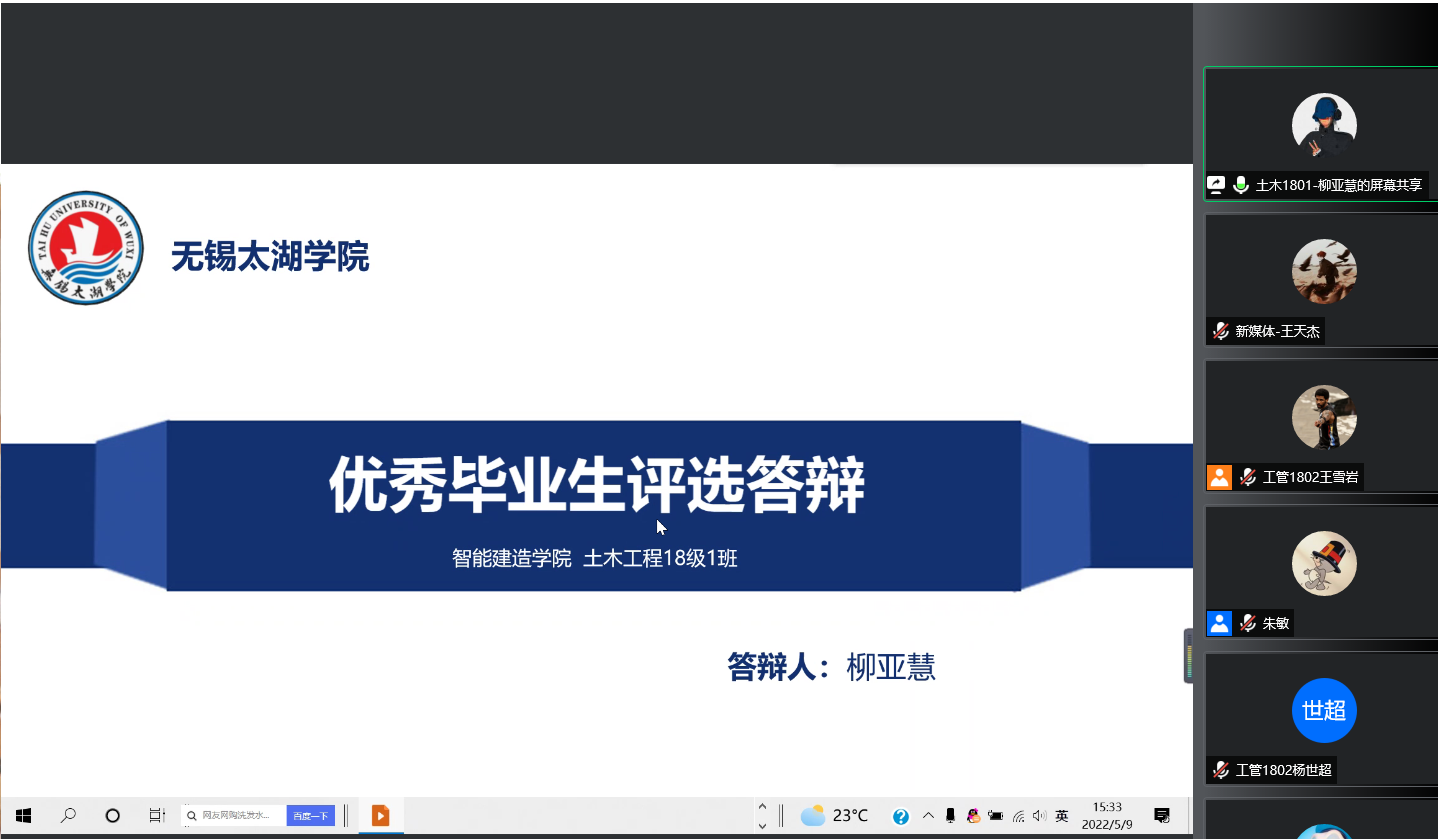 为全面落实立德树人根本任务,深入挖掘、树立和宣传学生中的先进典型,更好地激励和引导大学生勤奋刻苦,培育学生成长成才。5月9日下午,智能建造学院举行beat365正版唯一官网2022届优秀毕业生评选线上答辩。本次答辩会由学院党总支副书记余波、学工秘书朱敏、毕业班辅导员陈利娟担任评委,共有12位毕业生参与此次答辩。