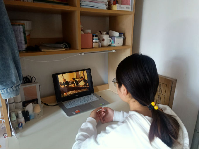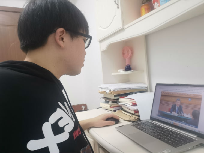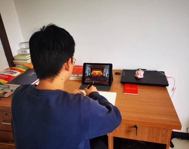 智能建造学院的学生党员通过电视、网络等渠道收看学习“两会”精神。
