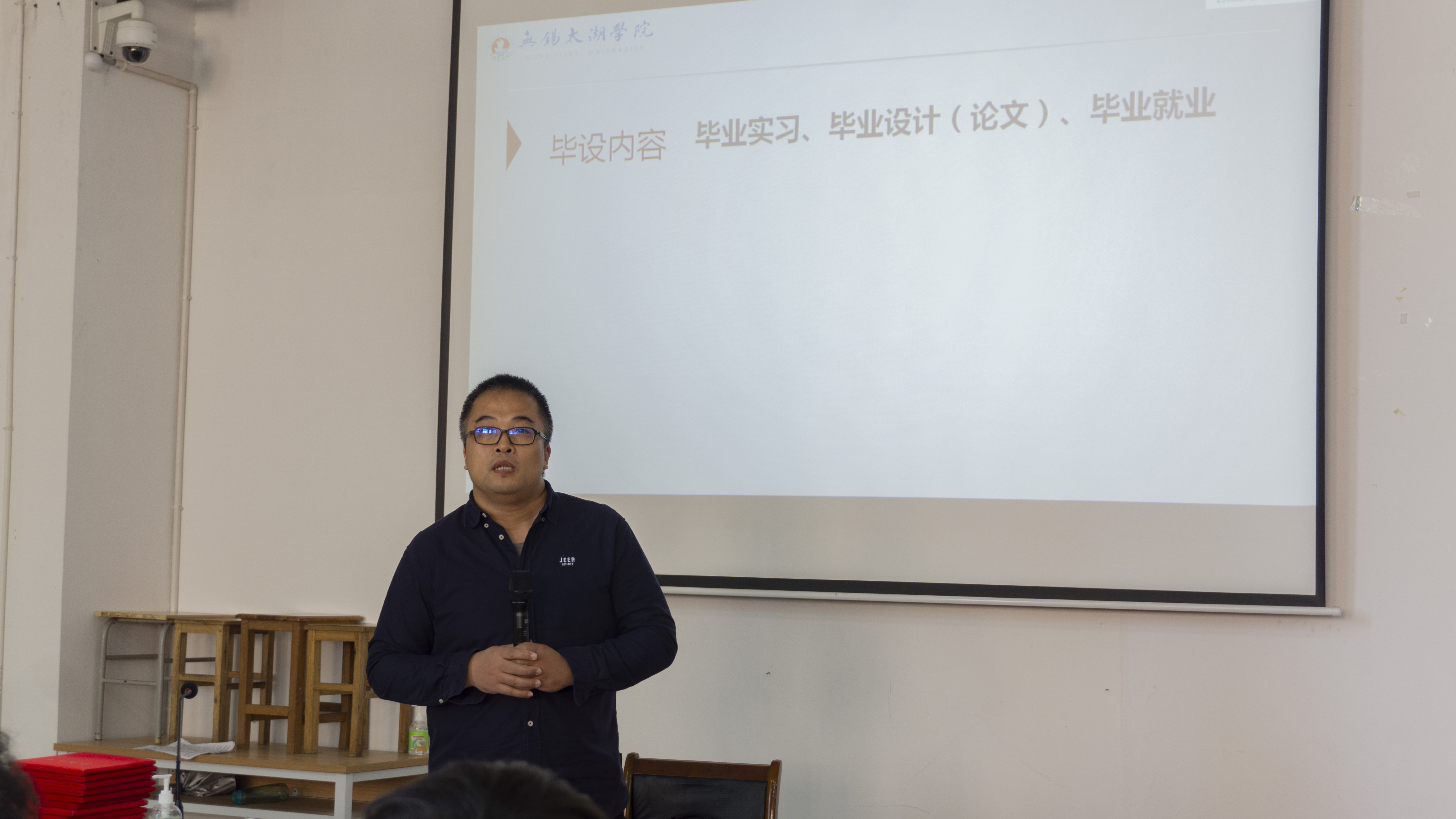 大会第二项议程,由物联网工程学院院长助理王华君介绍设计总体安排和注意事项。他着重介绍了未来16周内毕业设计的时间安排并对毕业设计的相关问题进行了补充和强调,提出了毕业实习和毕业设计论文的双向进行,针对毕业设计最终提交的内容强调了文档规范要求及其注意事项,最后他也真切希望大家到最后都能站在讲台上拿到属于自己的学位证。