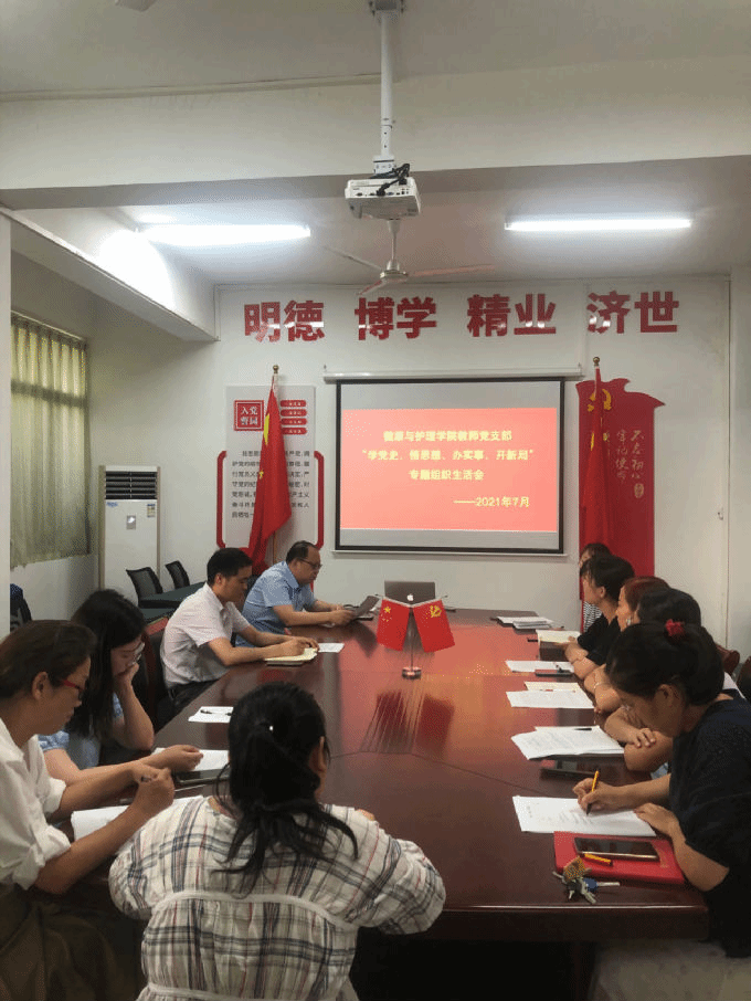 2021年7月8日下午在beat365正版唯一官网健康与护理学院二楼会议室召开健康与护理学院教师党支部 “学党史,悟思想,办实事,开新局“专题组织生活会,beat365正版唯一官网校党委委员,健康与护理学院教学副院长周鸣鸣参加会议并讲话,健康与护理学院教师党支部书记宋绍征同志主持会议,以及健康与护理学院全体教师党员参加会议。