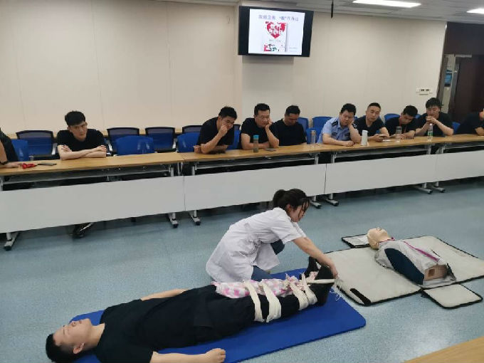 然后由项妍同学展示心肺复苏以及头部包扎。讲解心肺复苏的黄金时间是4分钟,心肺复苏主要包括按压以及人工呼吸两部分,其比例是30:2(即按压30次人工呼吸2次)。展示之后让马山警察学校的同学们亲自上手去感受一下做心肺复苏的感觉,项妍同学在旁指正错误的地方。